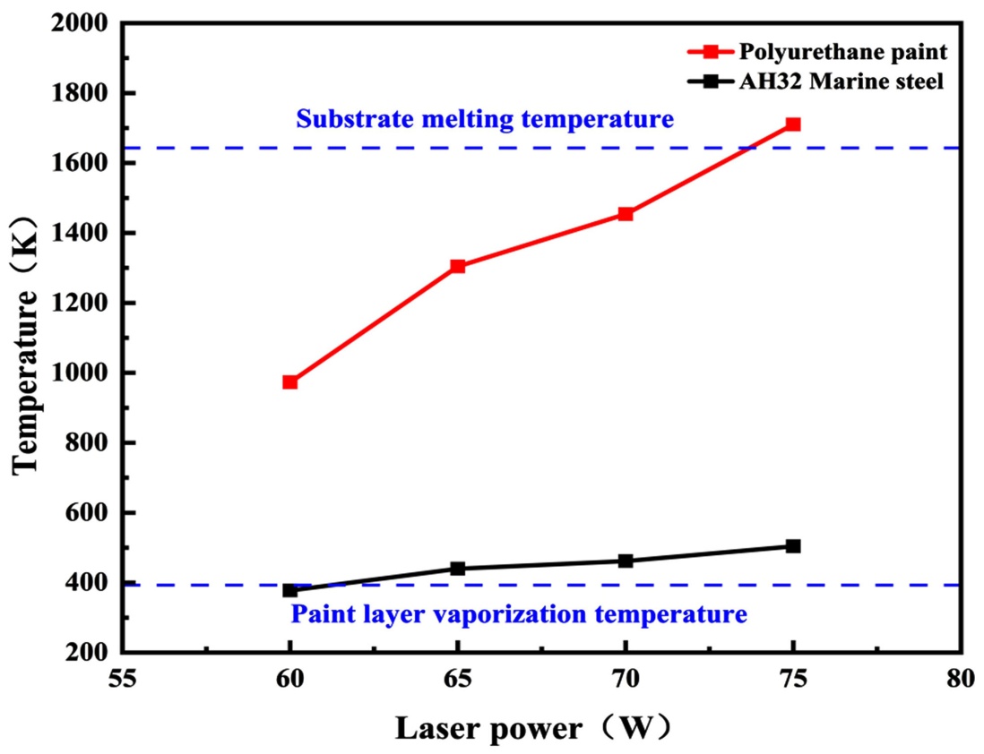 本研究明确了激光功率与扫描速度对AH32船用钢表面聚氨酯漆层峰值温度的作用规律。清洗实验结果显示,采用70 W激光功率与2500 mm/s扫描速度这一参数组合,能够有效去除漆层并较好地保护基底,这一结果也从侧面验证了所建立数学模型的可靠性。