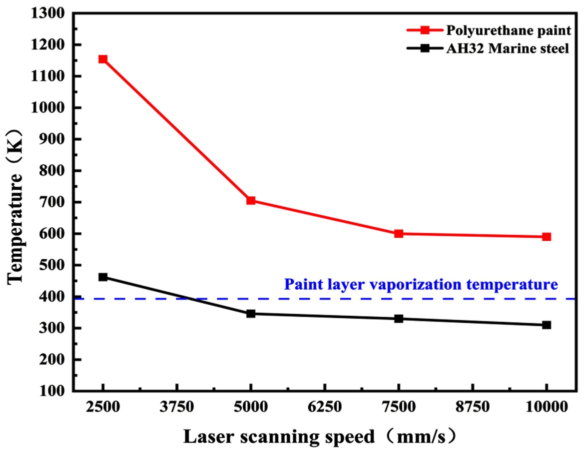 图5展示了漆层与基底表面峰值温度随激光扫描速度变化的规律。当扫描速度设定为2500 mm/s、5000 mm/s、7500 mm/s及10,000 mm/s时,漆层最高温度依次为1154 K、705 K、600 K与590 K,而基底最高温度则分别为462 K、446 K、330 K和310 K。从综合数据来看,当扫描速度达到5000 mm/s时,基底温度仅为342 K,尚未达到漆层的气化阈值。相比之下,只有在2500 mm/s的扫描速度下,漆层与基底表面的温度才同时处于较为理想的范围。因此,将扫描速度设定为2500 mm/s可视为较优的工艺参数选择。