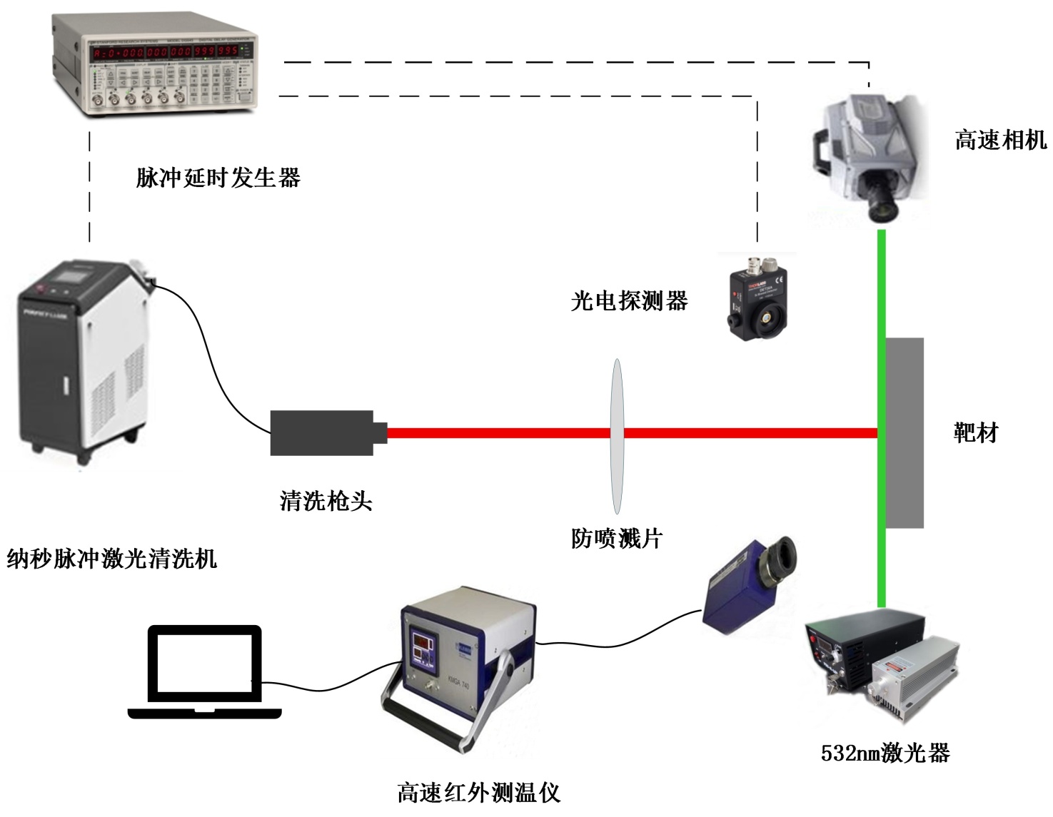 实验装置如图6所示,主要由纳秒脉冲激光清洗机、532 nm波长激光器、防喷溅保护镜、可移动三维样品台、CCD高速相机、脉冲延时触发器、光电探测器以及高速红外测温仪等组成。激光清洗机的输出功率可在0~100 W范围内连续调节。通过金相显微镜和三维自聚焦表面轮廓仪对试样表面进行观测,我们采集并分析了经激光处理的区域形貌数据,进而获得表面粗糙度信息。这一方法有助于系统考察激光参数与清洗效果、清洗效率之间的关联规律。