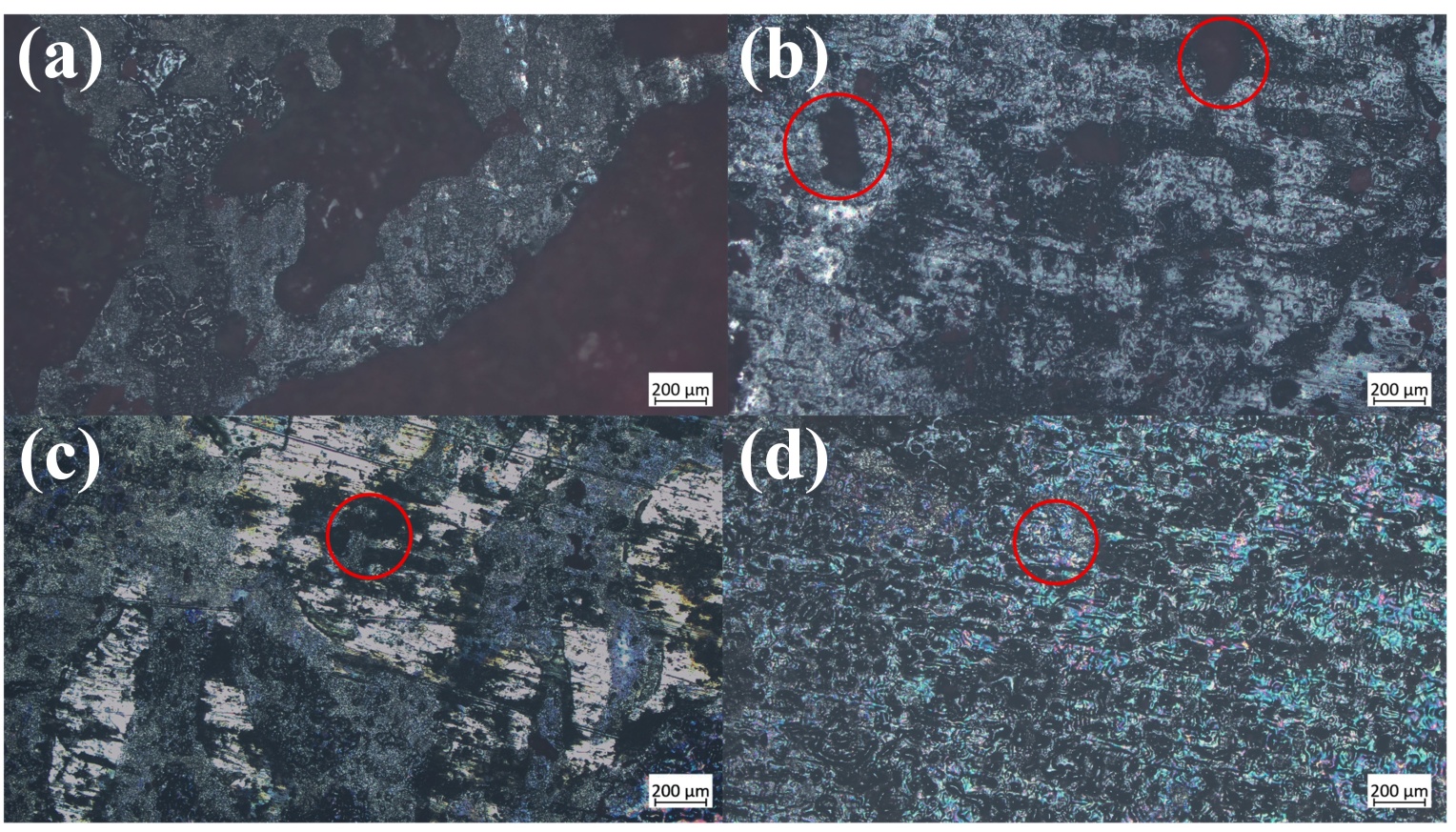 图7. 不同激光功率下船用钢表面形貌:(a) 60 W;(b) 65 W;(c) 70 W;(d) 75 W