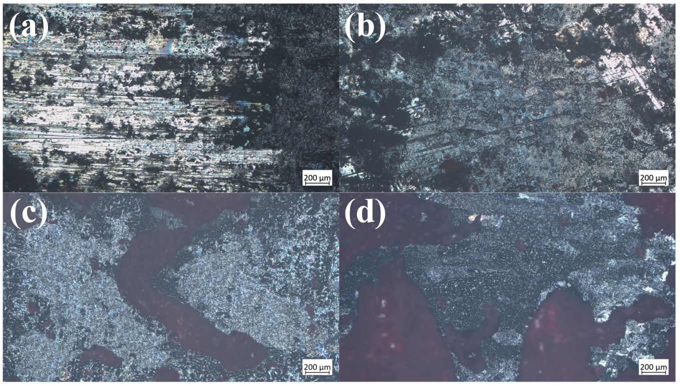 图8. 不同扫描速度下船用钢表面形貌:(a) 2500 mm/s;(b) 5000 mm/s;(c) 7500 mm/s;(d) 10,000 mm/s