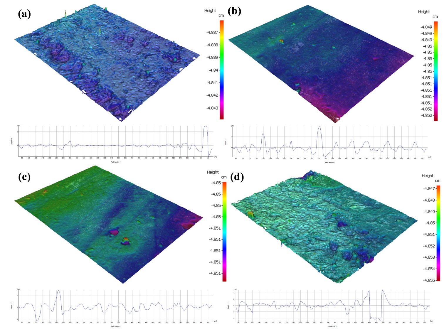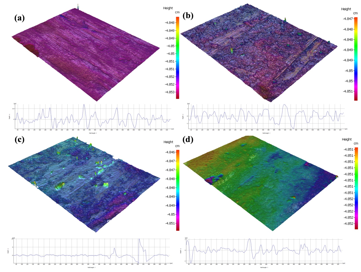 Figure 9. Three-dimensional topography and roughness of shipbuilding steel surfaces under different laser power levels: (a) 60 W; (b) 65 W; (c) 70 W; (d) 75 W
