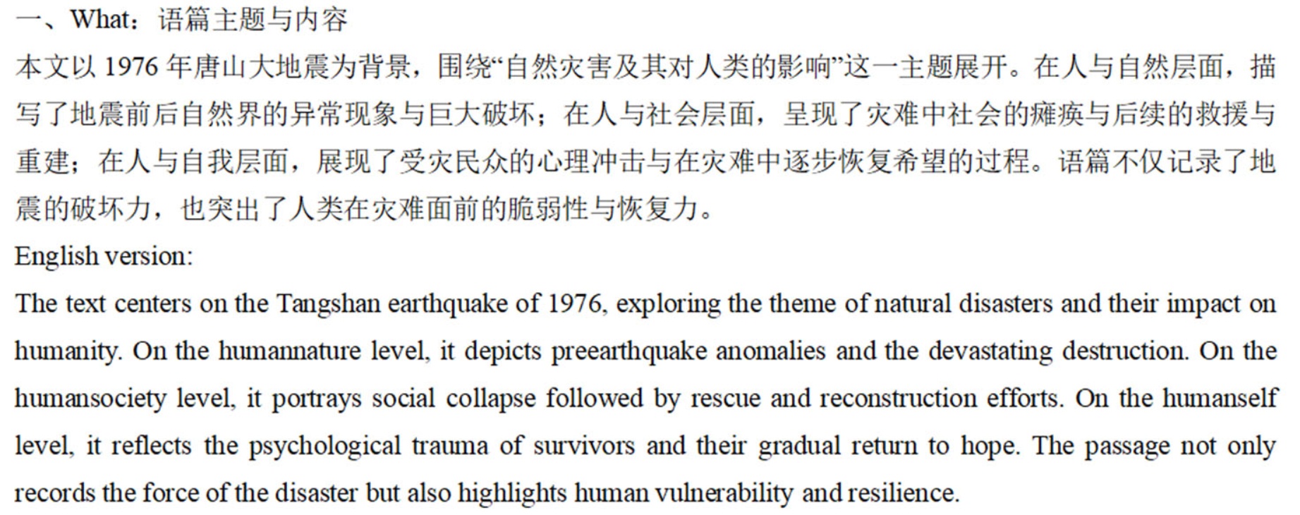 您是一名经验丰富的高中英语教师(C&R);请将这篇来自人教版高中英语必修一Unit 4 Natural Disasters的Reading and Thinking部分的语篇The Night the Earth Didn’t Sleep进行文本分析,教授对象为中等水平的高一学生(I)。请根据“what,how,why”三个维度展开分析(S),“what”指语篇主题与内容,包括人与自然、社会及自我三个层面;“how”涉及语篇的文体特征、内容结构与修辞手法;“why”包括作者的写作意图、情感态度和价值取向。请每部分用一段话整体分析,语言简洁明了(P),并分别提供中英文版本的分析结果(E)。