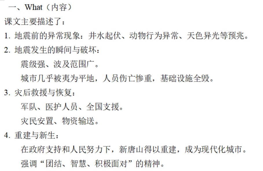 在本课教学中,教师可以借助AIGC设计层次分明、目标明确的学习活动,帮助学生梳理文本的核心信息,按时间顺序整合地震发生过程中的关键细节,并分析修辞手法在呈现前兆现象与灾后重建中的表达效果。通过这类结构化活动,学生不仅能加深对语篇内容与语言特点的理解,也能增强对自然灾害应对策略的现实认知。