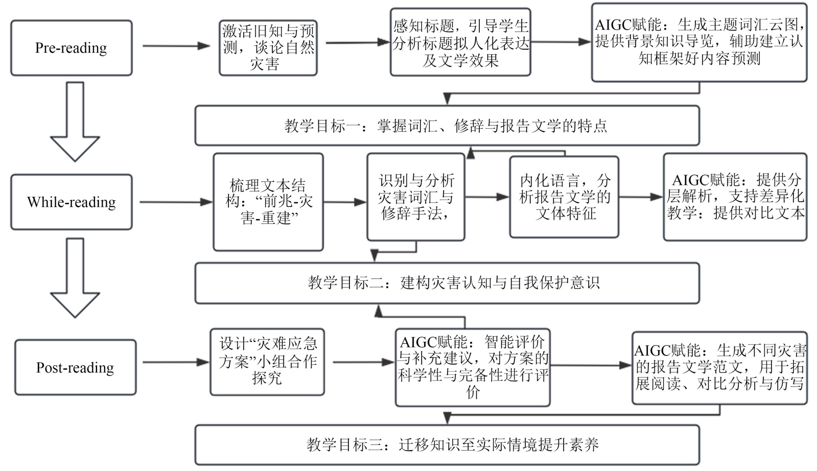 AIGC生成的教学目标从语言能力、文化意识、思维品质及学习能力四个方面展开,涵盖了震前、震中和震后的内容归纳,救灾精神的相关要点提炼,对标题中拟人手法及其隐喻分析,以及灾害应对物资的讨论,一定程度上对教师具有参考价值。然而,由于AIGC缺乏对教学目标整体架构及学生认知逻辑的深度理解,所生成目标往往呈现机械罗列、缺乏内在联系。但教学目标设计不应孤立分割,而应予以融合贯通。因此,教师应在AIGC生成内容的基础上,结合具体学情,对目标进行有机整合与动态调整,以增强教学实施的针对性与实效性。综合以上考虑,本研究对该语篇的教学目标进行以下优化:学生能够识别并分析文中与灾害相关的词汇及修辞手法,掌握报告文学的语言特点;学生能够形成应对自然灾害的自我保护意识,掌握相关防护与安全措施,构建对自然灾害的整体认知;学生能够将所学知识迁移至实际情境,有效应对灾害,提升自我保护能力与综合素养。