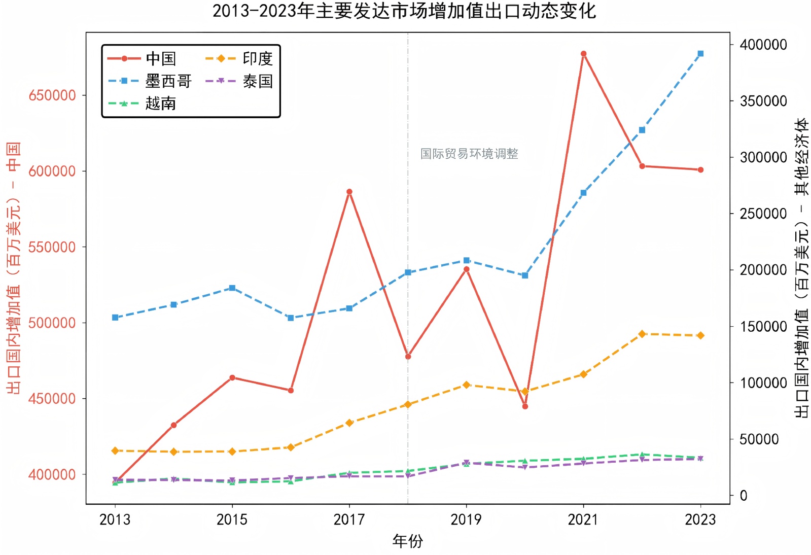 从区域格局来看,印度、越南、泰国等亚洲经济体也在这一过程中扮演了重要角色。印度对该市场出口增加值在2020年后明显提升,逐步扩大贸易份额;越南则保持稳步上升态势,2018年后增速加快,成为出口增长较快的新兴力量;泰国虽增长平缓,但整体维持稳定。