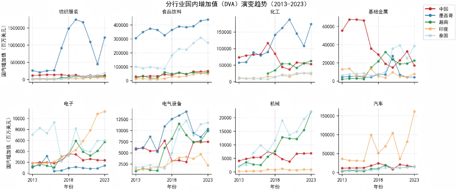 图2呈现了2013~2023年中国、墨西哥、越南、印度、泰国五大经济体在八大行业出口国内增加值(DVA)的动态演变,直观反映了全球产业链在国际贸易竞争与外部环境冲击下的重构趋势。DVA作为剔除进口中间品投入后的核心指标,精准衡量了各国产业真实获利能力与产业链掌控力,其波动与分化背后,是全球产业链从“效率优先”向“安全与韧性优先”的深刻转型。