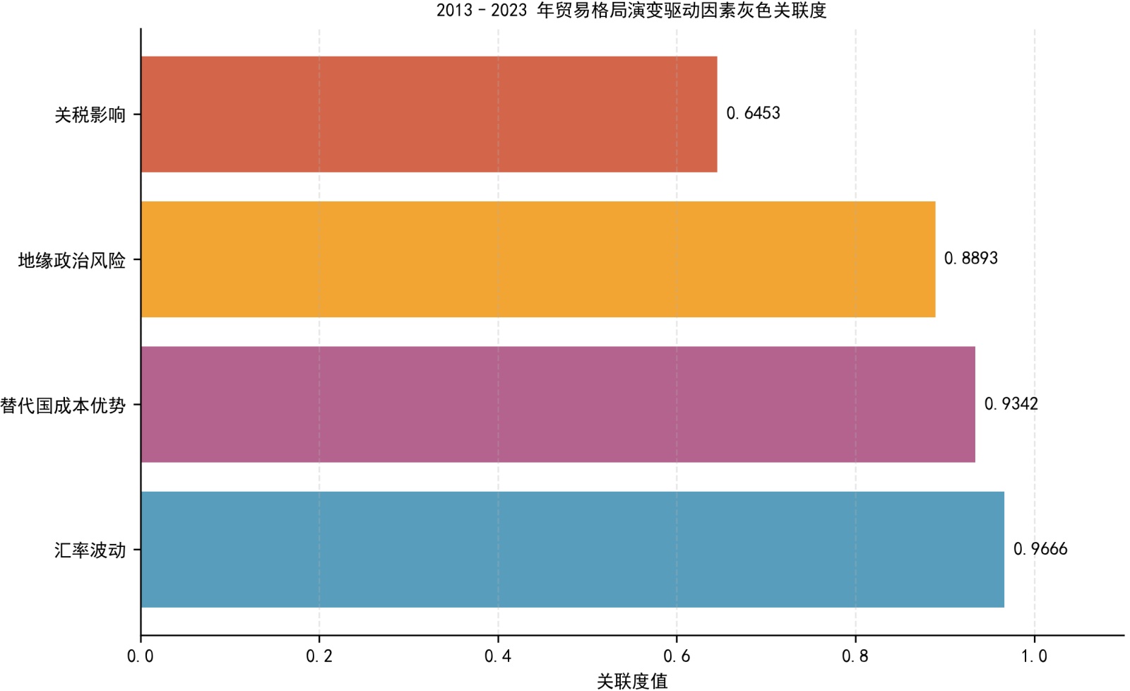 关联度越接近1,说明该解释变量(如汇率、地缘风险)对贸易流向的影响越具主导性。
