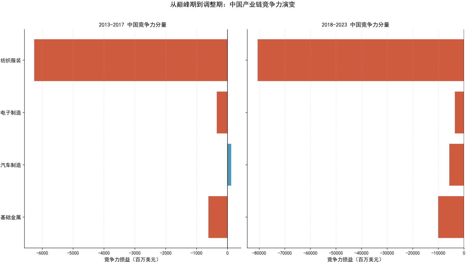 在2013~2017年的“巅峰期”,中国纺织服装行业的竞争力损失最为显著(接近−6000百万美元),传统劳动密集型产业的原有优势已开始松动;电子行业竞争力损失处于中等水平,行业相对优势逐步收窄;基础金属行业竞争力损失较小,整体竞争力保持相对稳定;而汽车行业的竞争力损失尤为突出(接近−6000百万美元),反映出当时本土汽车产业依赖进口中间品与外资品牌、核心竞争力不足的弱势特征。
