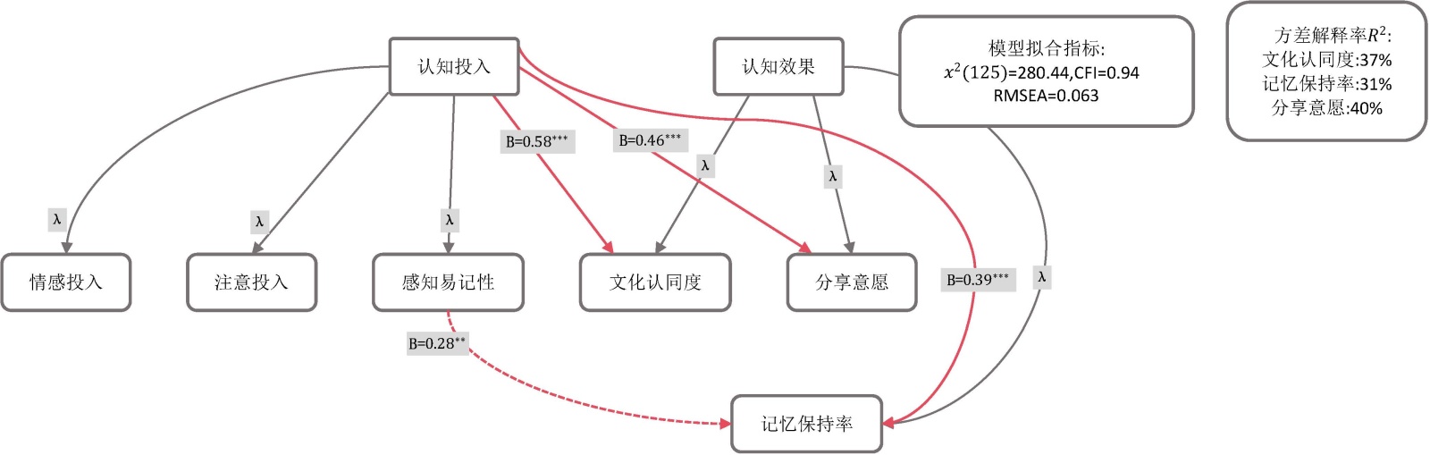 在考察交互效应前,首先构建并检验了“认知投入→认知效果”的基础结构模型,如图3所示。使用全样本数据,以认知投入的三个维度为外生潜变量,认知效果的三个维度为内生潜变量,构建结构方程模型。模型拟合可接受:χ2(125) = 280.44,CFI = 0.94,RMSEA = 0.063。路径系数显示:情感投入对文化认同度(β = 0.58, p < 0.001)和分享意愿(β = 0.46, p < 0.001)具有最强的正向预测作用;注意投入对记忆保持率(β = 0.39, p < 0.001)的预测作用最为显著;感知易记性对记忆保持率(β = 0.28, p < 0.01)也有独立贡献。该模型解释了文化认同度37%的方差、记忆保持率31%的方差、分享意愿40%的方差,为假设H4提供了坚实的初步证据。