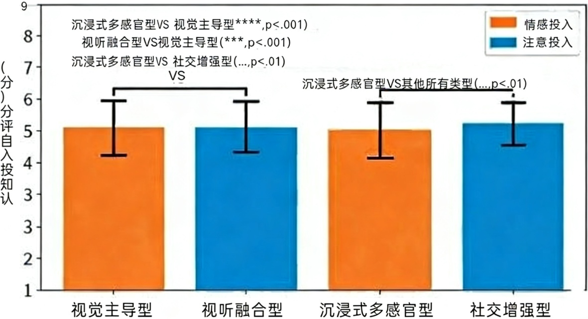 主效应与交互效应检验(H1, H3):以四种多模态交互类型为重复测量因子、文化背景组别为组间因子,对三种认知投入的即时自评分进行重复测量MANOVA。结果显示,交互类型主效应显著(Wilks λ = 0.72, p < 0.001),见表3。进一步分析表明,交互类型对情感投入与注意投入的影响均显著(ps < 0.001),如图4所示。