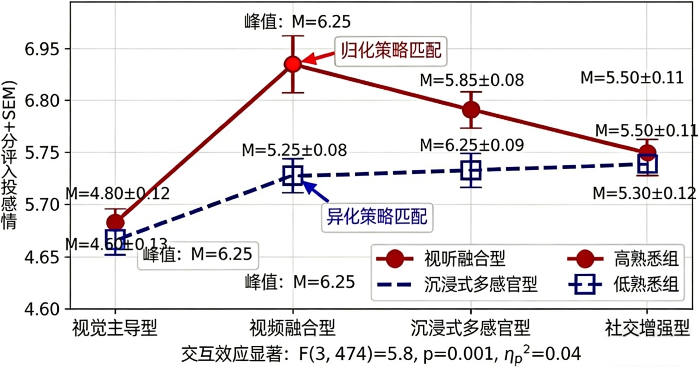 事后检验发现,在情感投入上,沉浸式多感官型与视听融合型均显著高于视觉主导型(ps < 0.001),二者之间无显著差异;社交增强型显著高于视觉主导型,但低于沉浸式。在注意投入上,沉浸式多感官型显著高于其他所有类型(ps < 0.01)。文化背景的调节作用显著,情感投入上交互类型与文化背景存在显著交互效应(p = 0.001),见表4。简单效应分析显示,对于高熟悉度组,视听融合型的情感投入最高,并显著高于沉浸式;对于低熟悉度组,沉浸式多感官型的情感投入最高,且显著高于视听融合型。结果支持H1与H3。如图5所示。