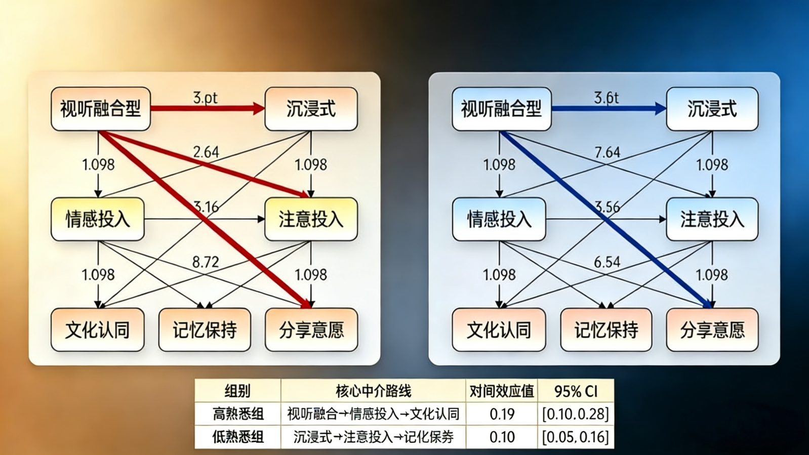 中介效应检验(H2, H4):采用Bootstrap法构建多组多重中介模型进行分析。结果支持H2与H4:情感投入是“沉浸式/视听融合型→文化认同/分享意愿”的核心中介路径(间接效应显著);注意投入是“沉浸式→记忆保持率”的主要中介路径(间接效应显著)。多组比较进一步显示,对于高熟悉度组,“视听融合型→情感投入→文化认同”的路径更强;对于低熟悉度组,“沉浸式→注意投入→记忆保持”的路径更强,见表5。这表明认知投入的差异化影响路径受文化背景调节,如图6所示。