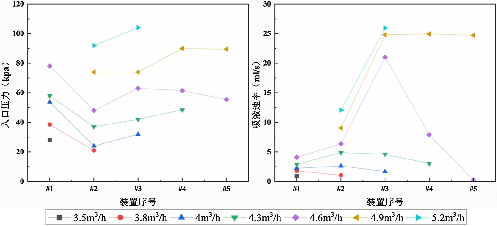 图2展示了不同入口流量下装置吸液速率与入口压力。从图中可以看出,吸液速率与入口流量呈现正相关。同时,在流量达到4.6 m3/h后,装置#3吸液速率有明显的上升,流量到了4.9 m3/h后,装置#4的吸液速率也上升到了与#3同样的水平。这是因为喉管直径较小的装置受限于喉管的流通面积有限,气体引射液体上来之后液体的流通面积较小,即使再大的气体流量也没法让吸液量升到比较高的水平,因此从装置#1到装置#2虽然随着气体流量的增加,吸液速率上升速度加快但是上升程度有限;从装置#3开始,喉管直径进一步扩大,被吸上来的液体有更大的流通面积,能够支撑大规模的引射液体流动,因此吸液速率显著上升。