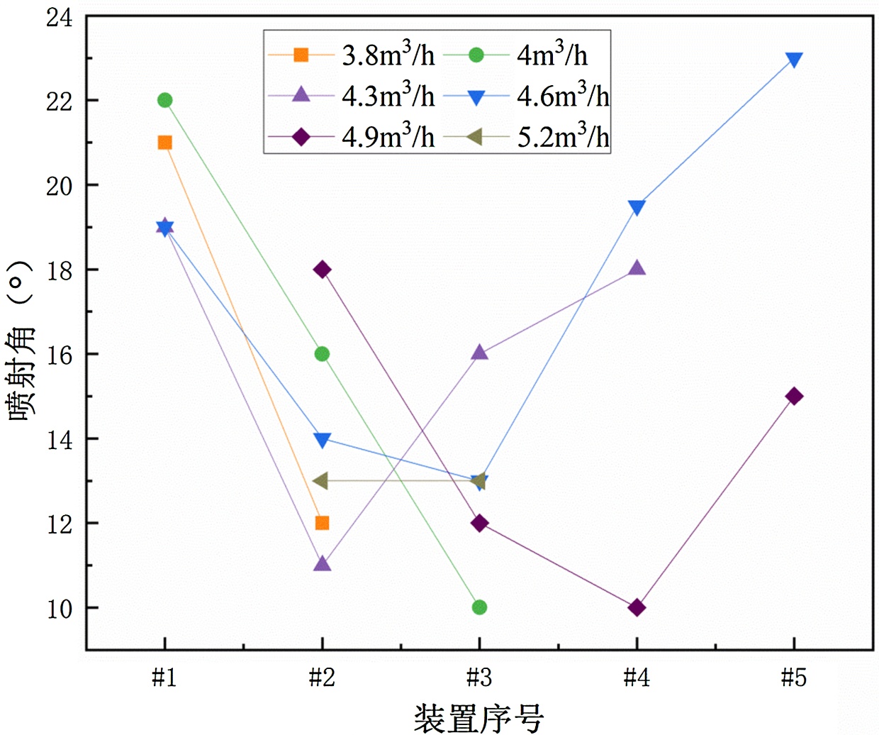 图5. 喷嘴直径6 mm装置的喷射角变化图