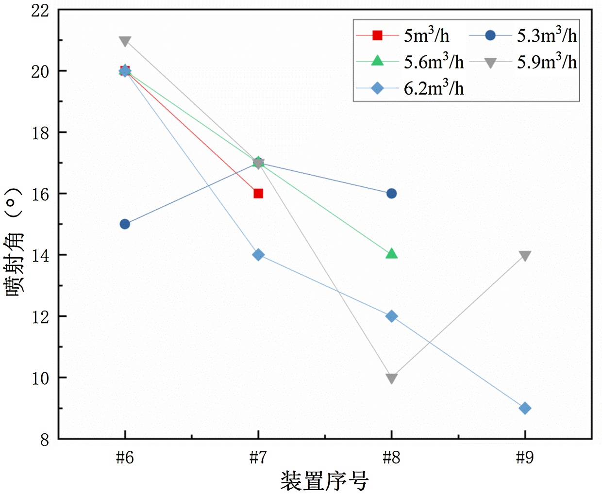 整体看下来,喷嘴直径6 mm的装置与喷嘴直径4 mm的装置在喉管直径较小时的规律相同。如果按照喷嘴直径4 mm的装置的喷嘴直径变化规律推测的话,应当有喷射角的上升,且越高流量的喷射角的低点装置序号越大,而在图像上流量5.9 m3/h的喷射角也确实出现了上升,同时流量6.2 m3/h的喷射角依旧在下降,说明喷嘴直径6 mm的装置和喷嘴直径4 mm的装置喷射角规律相似,都与喉管直径和喷嘴直径在数值上的相对关系有关。