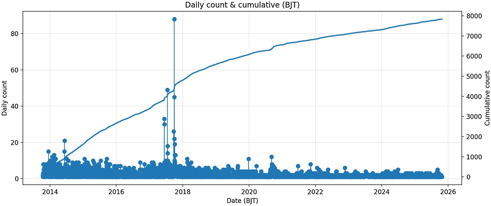1) 在簇发性指标的基础上,本文进一步对事件序列进行簇发段提取。具体做法为将事件按固定时间窗分箱统计,在事件计数序列上设置簇发阈值,并将连续超过阈值的时间段识别为簇发段。对每个簇发段,记录其起止时间、持续时间、包含的时间箱数、总事件数与峰值事件数等信息,并导出簇发段内事件目录以便复核。