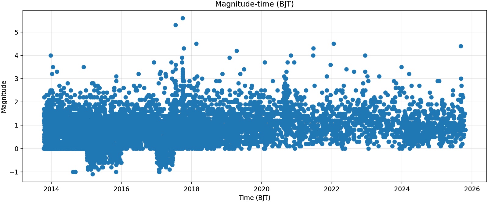 为确保本地微震事件集构建与统计分析的可复现性,本文定义了事件合并、信噪比、相对量级和质量分级(A/B/C)等关键参数。首先,针对触发检测中可能因尾波或噪声波动产生的多个相邻触发事件,本文设定最小事件间隔阈值(30 s),将相邻触发时刻小于此值的视为同一事件,仅保留最早触发时刻。其次,信号质量通过信噪比表征,计算每个事件的信号窗与噪声窗的振幅比值,以RMS作为振幅度量。最后,鉴于缺乏统一的绝对震级标定,本文采用相对量级描述事件强度,计算公式为M_rel = (1/N) × sum[log10(Amax_i)],其中N为有效台站数3,Amax_i为各台站Z分量的最大绝对振幅。M_rel仅用于同一系统内的相对比较,并不等同于标准震级。