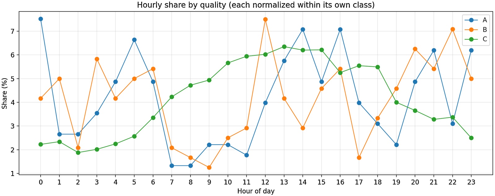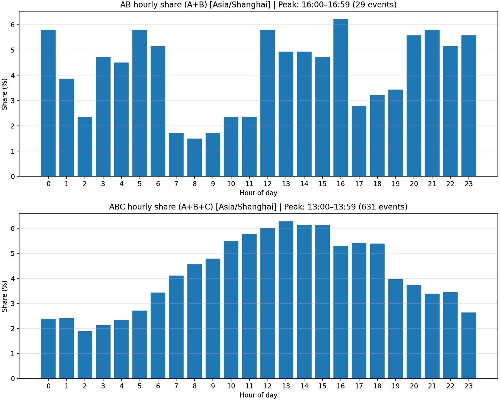 2) 图7为分析日内变化,本文统计事件在24小时内的发生占比,并分别给出AB与ABC的小时分布。结果表明,事件在13时段占比最高,而在2时段占比最低;AB与ABC的日内分布对比显示ABC更集中,为区分真实活动变化与噪声/检出能力差异提供依据。