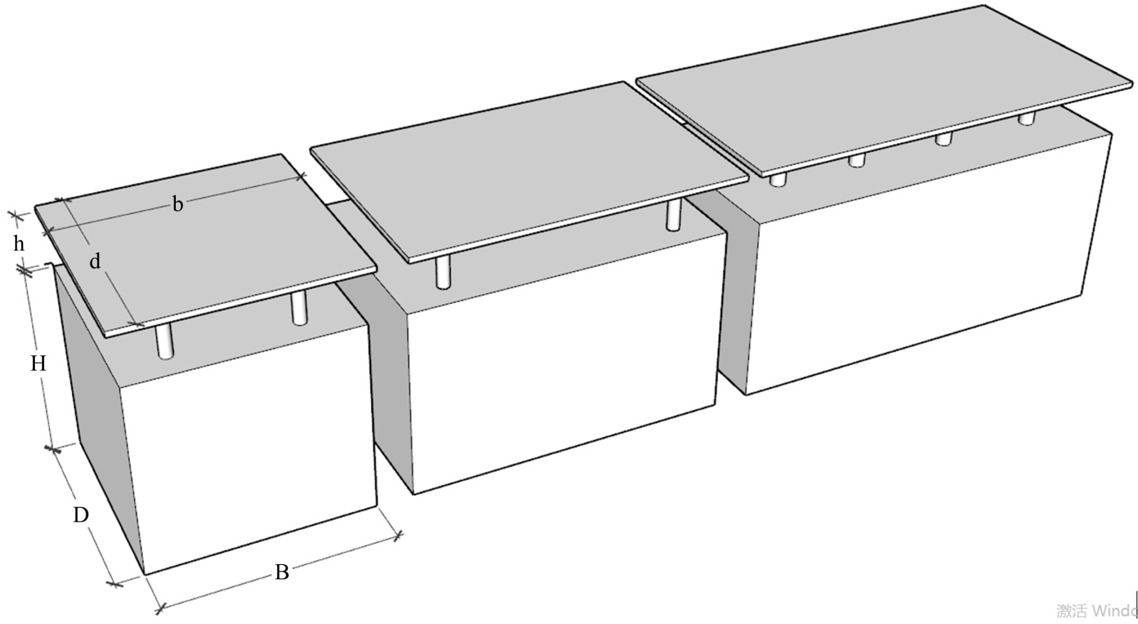 试验模型缩尺比为1:40,在风洞中的布置情况如图1所示。试验模型下部建筑尺寸长(B)分别为300 mm、450 mm、600 mm,宽(d)为300 mm,高(h)为270 mm,对应不同建筑长宽比(1:1, 1.5:1, 2:1),如图2所示,最大模型阻塞比为1.57%,满足规范小于5%的要求。架空光伏屋面水平平铺,尺寸长(b)分别为320 mm、470 mm、620 mm,宽(d)为320 mm,距离底部建筑屋顶高度(h)为75 mm,与底部建筑高度比为1:3.6。测点布置如图3所示,上下对称布置。