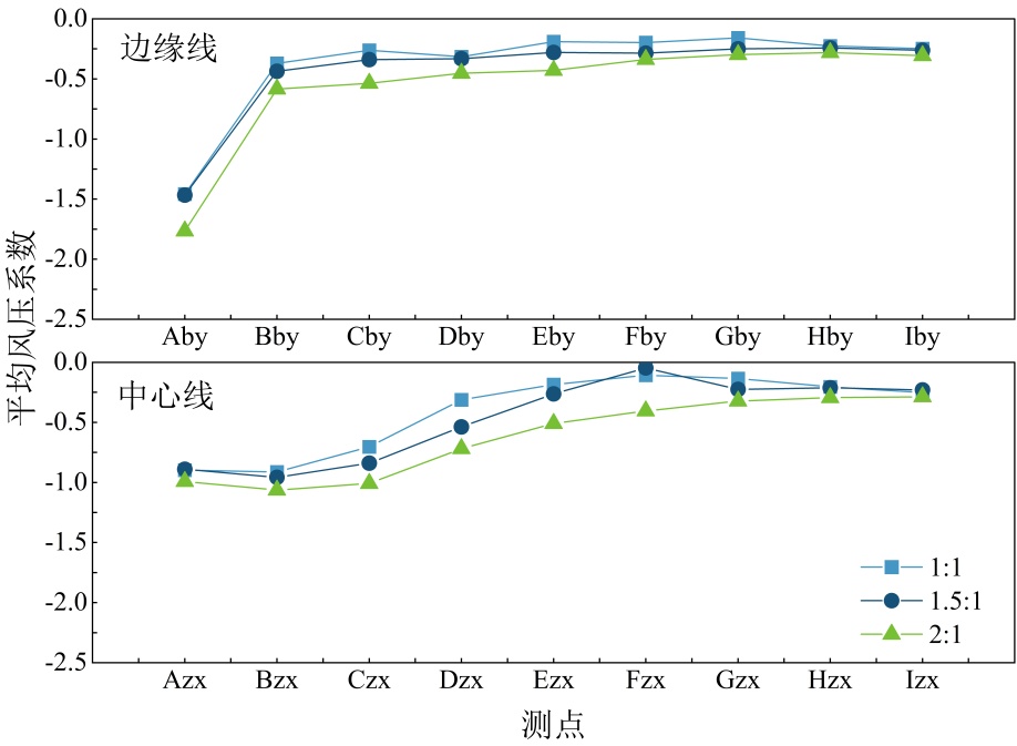 图5展示了0˚风向角下不同长宽比的光伏屋面上、下表面沿边缘线测点和中心线测点的平均风压系数分布。从图5(a)可以看出,所有模型上表面均承受风吸力作用,最大平均风压系数均由于光伏屋面前缘的气流分离出现在迎风前缘角部测点,下游区域出现间歇性再附导致沿风向风吸力逐渐减小并趋于平稳,此外还可以观察到长宽比为1:1的模型与长宽比为1.5:1的模型数值更为接近,而长宽比为2:1的模型平均风压系数最大。从图5(b)可以看出,各模型平均风压系数差异相较于上表面更小,说明长宽比的变化对下表面的影响较小,下表面迎风前缘分离泡发展一段距离后达到最大半径,因此边缘和中心线区域各模型的平均风压系数均在距离前缘一段距离后达到最大值,此时边缘线区域长宽比为2:1的模型平均风压系数最大。
