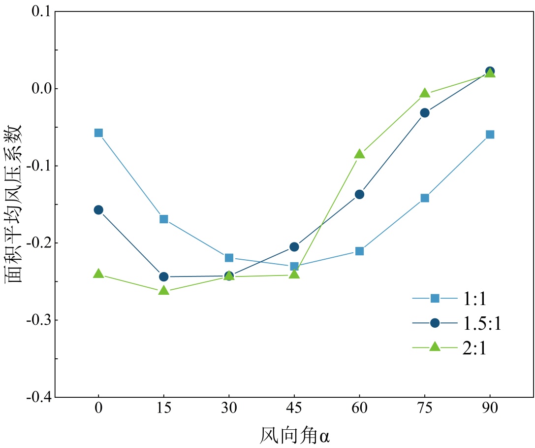 图9展示了不同长宽比下光伏屋面的面积平均风压系数随风向角的变化规律。从图中可以看出,三个模型的变化规律相似,均随着风向角的增大而呈现先增大后减小的趋势,且均以风吸力为主,此时长宽比为1:1的模型的面积平均风压系数在−0.06~−0.23范围内变化,长宽比为1.5:1的模型的面积平均风压系数在0.02~−0.24范围内变化,长宽比为2:1的模型的面积平均风压系数在0.02~−0.26范围内变化。在0˚~30˚风向角范围内,光伏屋面的面积平均风压系数随着长宽比的增大而增大,而随着长宽比为1.5:1与长宽比为2:1的模型的迎风边由长边逐渐转变为短边,光伏屋面的面积平均风压系数逐渐转变为随着长宽比的增大而减小的趋势,并且长宽比为1.5:1的模型与长宽比为2:1的模型均在90˚风向角下由风吸力转变为较小风压力。