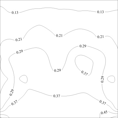 图11给出了45˚风向角下不同长宽比光伏屋面脉动净风压系数分布图。可以看出,三个模型均受到锥形涡的影响导致最大脉动净风压系数均出现在迎风前缘两侧角部区域,并且最大脉动净风压系数随着长宽比的增大而逐渐增大,此时长宽比为1:1的模型的最大脉动净风压系数为0.76,长宽比为1.5:1的模型的最大脉动净风压系数为0.97,长宽比为2:1的模型的最大脉动净风压系数为0.98。与平均风压系数的规律类似,45˚风向角下,随着长宽比的增大,其对光伏屋面最大脉动净风压系数的影响逐渐削弱。