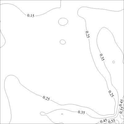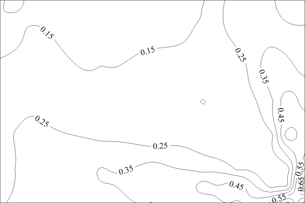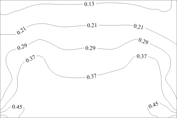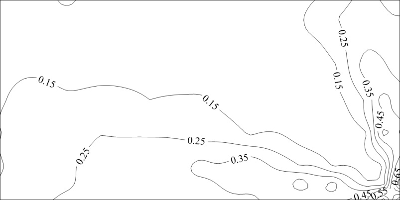 图13给出了45˚风向角下不同长宽比光伏屋面极值净风压系数分布图。可以看出,该风向角下各模型极值净风压系数均从迎风前缘沿对角线扩展,最大极值净风压系数均出现在迎风前缘的两侧角部区域,其值随着长宽比的增大而逐渐增大,长宽比为1:1的模型的最大极值净风压系数为−5.64,长宽比为1.5:1的模型的最大极值净风压系数为−6.27,长宽比为2:1的模型的最大极值净风压系数为−6.32。在45˚风向角下,长宽比增大至一定程度后,其对极值净风压系数幅值的影响逐渐削弱。