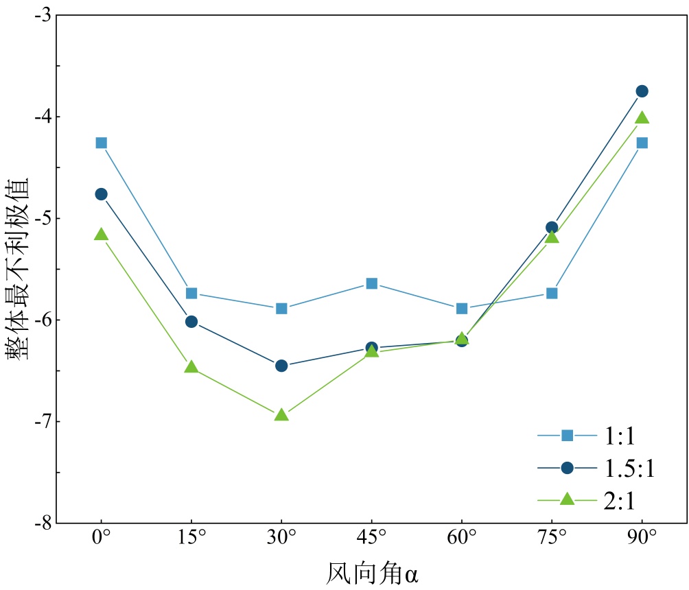 图14展示了不同长宽比光伏屋面最不利极值净风压系数随风向角的变化规律。可以看出,随着风向角从0˚~90˚变化,最不利极值净风压系数呈现先增大后减小的趋势,各模型均在30˚风向角下达到最不利极值,此时长宽比为1:1的模型的最不利极值净风压系数为−5.89,长宽比为1.5:1的模型的最不利极值净风压系数为−6.45,长宽比为2:1的模型的最不利极值净风压系数为−6.95。在0˚~30˚风向角下,长宽比对光伏屋面的影响较大,最不利极值净风压系数随着长宽比的增大而逐渐增大,而在45˚风向角下长宽比为1.5:1的模型与长宽比为2:1的模型的数值接近,在75˚和90˚风向角下,由于长宽比为1.5:1的模型与长宽比2:1的模型的迎风边从长边过渡为短边,导致在该风向角下的最不利极值净风压系数小于长宽比为1:1的模型。