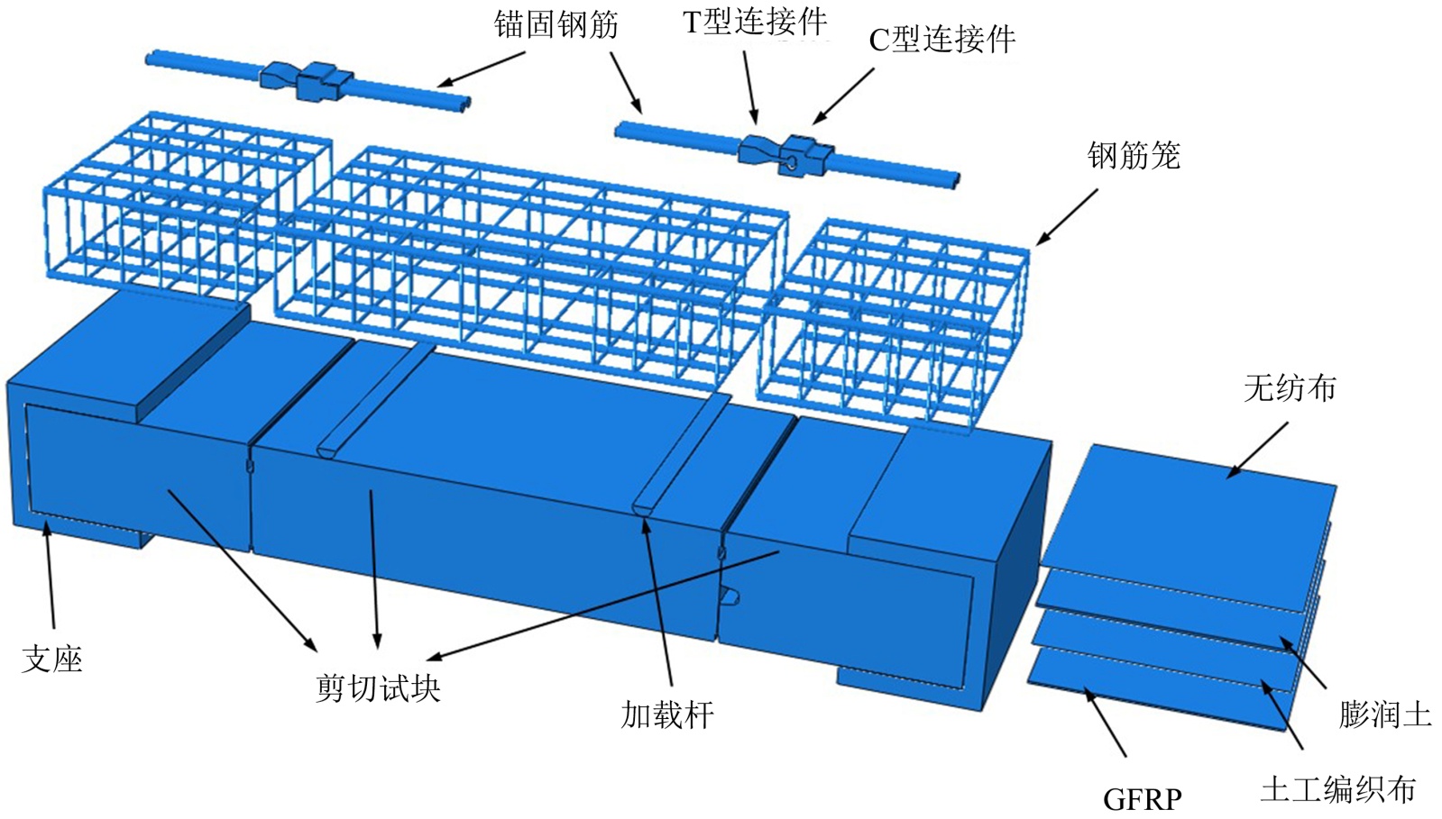 剪切块、支座、加载杆、C-T连接件、锚固钢筋、膨润土、玻璃钢采用实体单元进行建模;钢筋笼使用空间桁架单元建模,并进行一定简化,忽略构造钢筋,仅保留纵向受力钢筋以及箍筋;无纺布、土工编织布采用空间壳单元建模。数值模型的整体组成如图2所示。