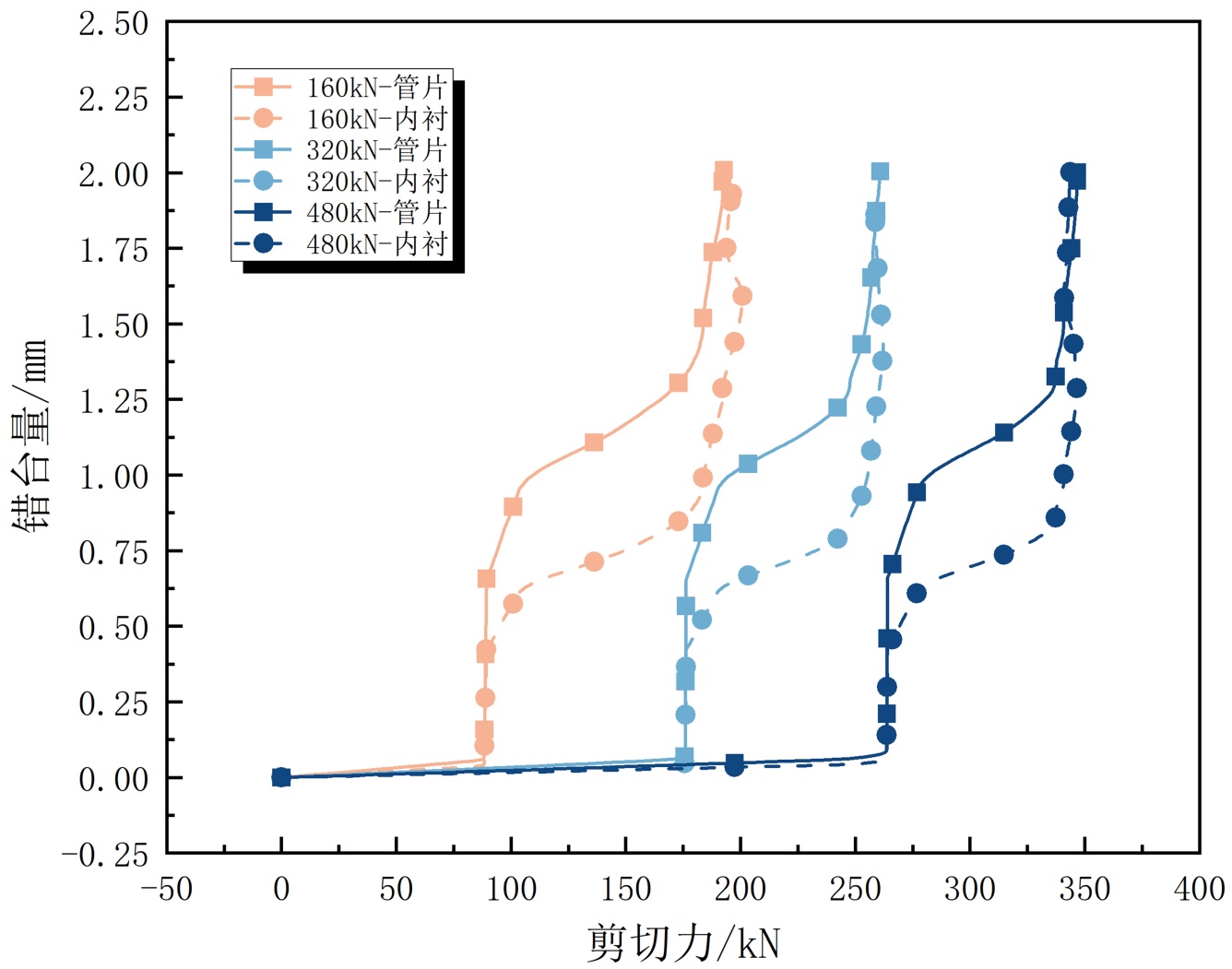 图3. 不同轴力下错台量–剪切力关系曲线