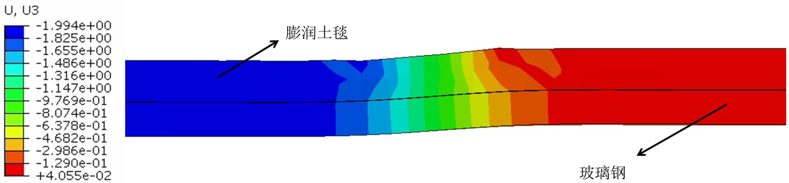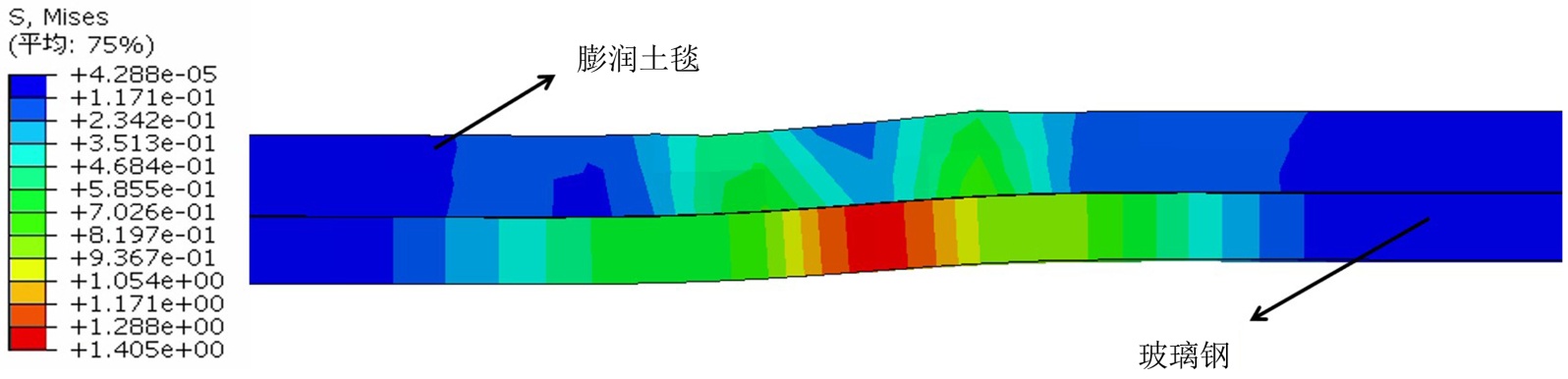 分析内衬在错台方向上的位移,距离接头较远的内衬随试块一同位移,而在接头处位移变化较为剧烈,导致内衬产生较大形变,进而引起应力的集中。对比内衬中膨润土毯层与玻璃钢层的位移分布,可以发现相比膨润土毯,玻璃钢在接头处的位移变化范围更大,说明内衬将接头处混凝土试块错台的突变转化为内衬表面连续的变化,极大提高隧道内表面的平整度。