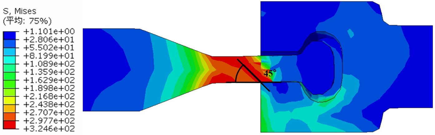 连接件破坏主要集中于T型连接件腹板位置。由于T型连接件端部与C型连接件榫槽相互咬合,随着接头错台量的逐渐增大,T型连接件腹板不仅承受剪力作用,同时还受到由几何约束引起的附加拉力作用。如图8所示,当接缝的错台量为1.5 mm时,T型连接件腹板位置的最大等效应力已达到324.6 MPa,结合应力分布云图以及T型连接件的屈服位置,可以发现该高应力区与以C型连接件下端为起点的约45˚方向基本一致,表明T型连接件腹板在剪力与拉力共同作用下发生弯剪破坏。