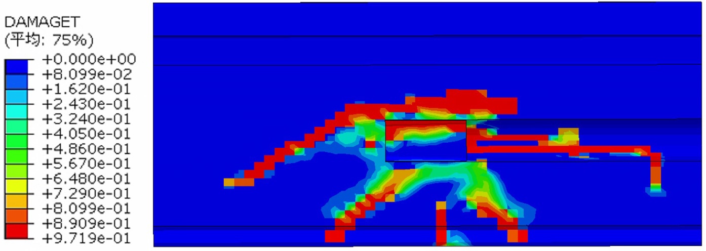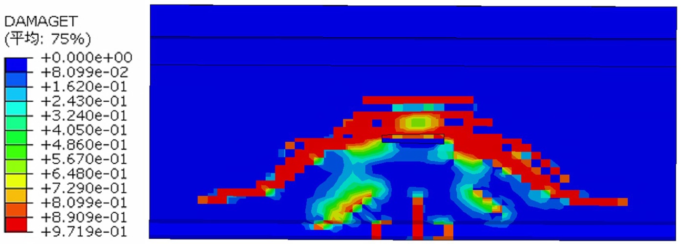5) 接头区域混凝土的破坏呈现出以拉伸破坏为主,局部伴随压缩破坏的复合模式。整体上,混凝土破坏主要表现为自连接件两端向混凝土试块下方约45˚方向扩展的拉裂缝,并形成三角破坏区;压破坏则高度集中于连接件附近局部区域,其应力水平显著超过混凝土抗压强度,与裂缝观测结果相互印证。