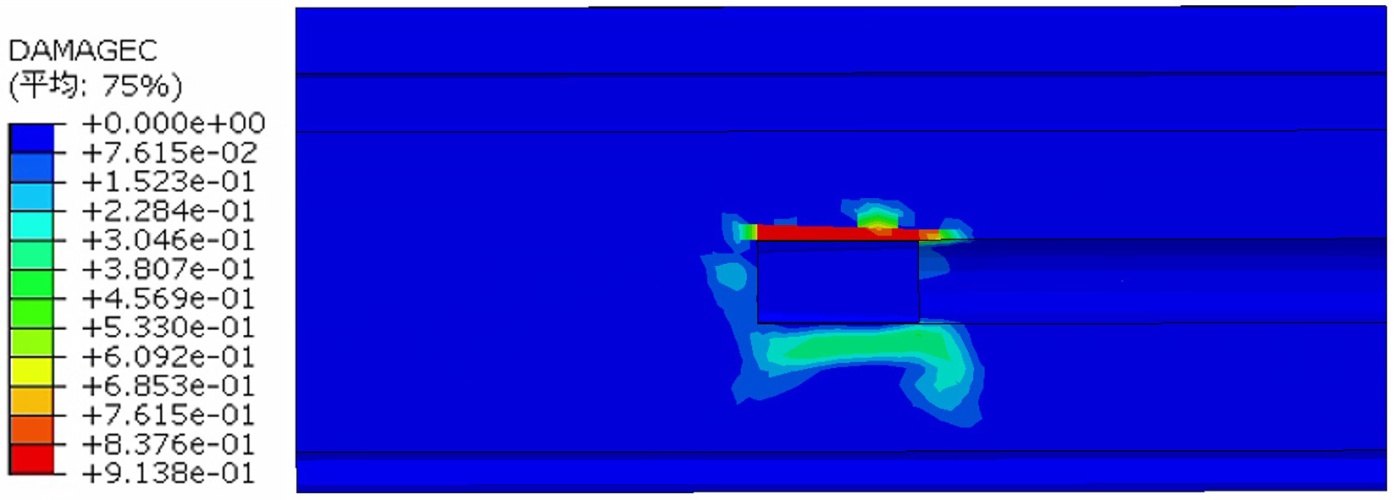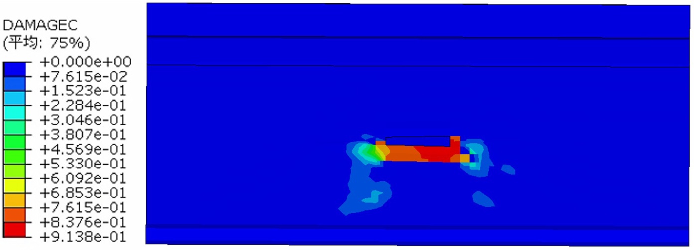 根据图10所示,右剪切块C型连接件上部混凝土出现明显压破坏。在无凹槽的一侧,拉裂缝分别从C型连接件上部端点附近与下部端点附近起裂,并沿约45˚角向混凝土试块底部延伸;而在有凹槽的一侧,由于凹槽处混凝土厚度较薄,结构相对薄弱,形成了沿凹槽由C型连接件向外延伸的拉裂缝,但C型连接件下部的拉裂缝未受凹槽影响,仍然以45˚角向试件底部延伸。对比图9(b)可以发现,拉破坏出现的位置与试块应力分布的范围大体上一致。