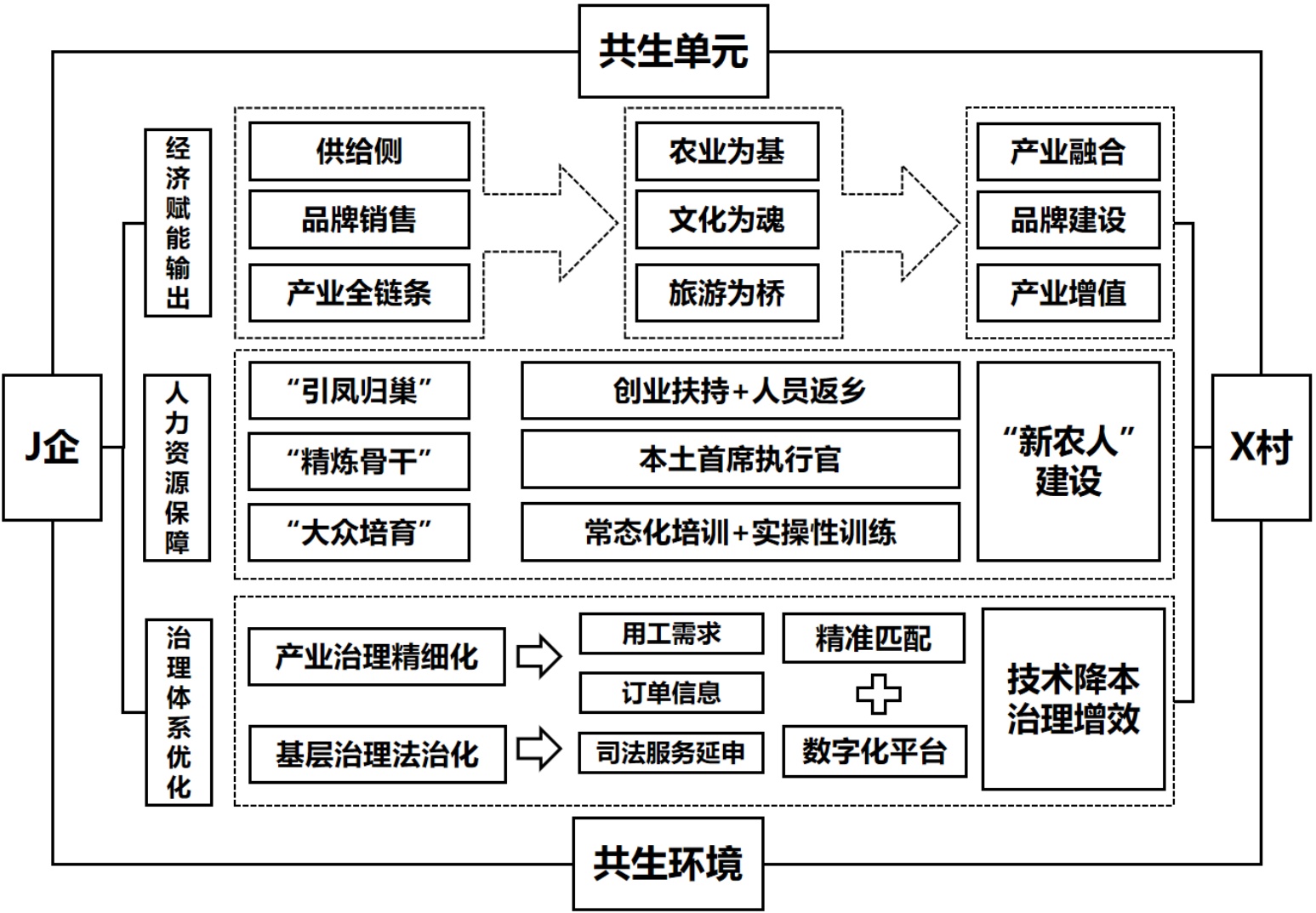 在乡村振兴的具体实践中,村企合作的模式不断创新,如何构建持久、对称、共赢的共生机制,实现从“输血帮扶”到“造血共富”的系统转型,仍是乡村振兴规划的关键课题。X村与J企的合作探索模式,依托“双向赋能”与“系统共生”的创新模式,实现从传统乡村到农文旅融合发展的“未来乡村”的跨越式发展,这得益于X村与J企之间强共生系统,并在此基础上形成可复制、可持续的共生模式。