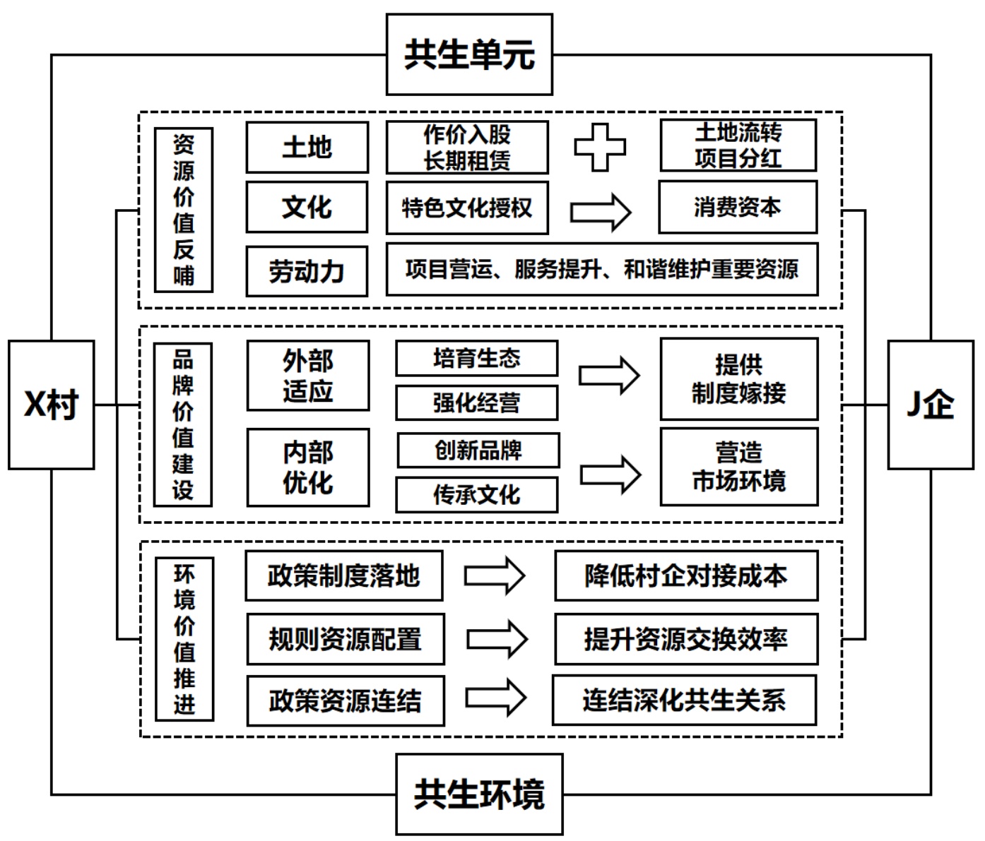 二是共生环境。作为共存价值实现载体,X村提供共存环境体系下多元核心资源,为J企构建价值实现生态。凭借“四议六步法”的高效治理能力,降低J企对接乡村的沟通与落地成本;依托毗邻H市主城区的区位优势及“未来乡村”数字化红利,承接城市消费外溢,为J企整合的企业资源提供广阔市场与变现渠道。J企基于共生需求的精准适配,通过“共富基金”以扶持产业发展、创新创业、人才培育等各类社会公益事业并搭建“村企共富联盟”发挥社会治理协同作用,为企业资源找到了下沉路径,也为村庄产业升级提供了资本支撑;以“归巢计划”、“领头雁计划”、“新农人计划”解决乡村人才短缺,也为企业培育了本土化运营团队;荣誉背书与“以商引商”既为村庄引流,也让参与企业获得品牌曝光与市场回报。而X村的反馈式共生,推动J企从“资源整合者”升级为“乡村共生生态构建者”,实现“赋能–反馈–再赋能”的动态共生进化。