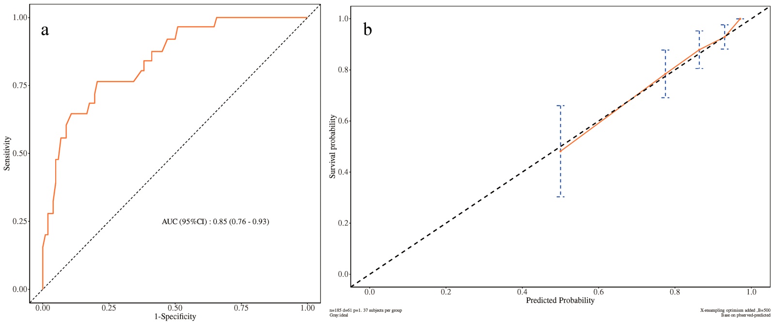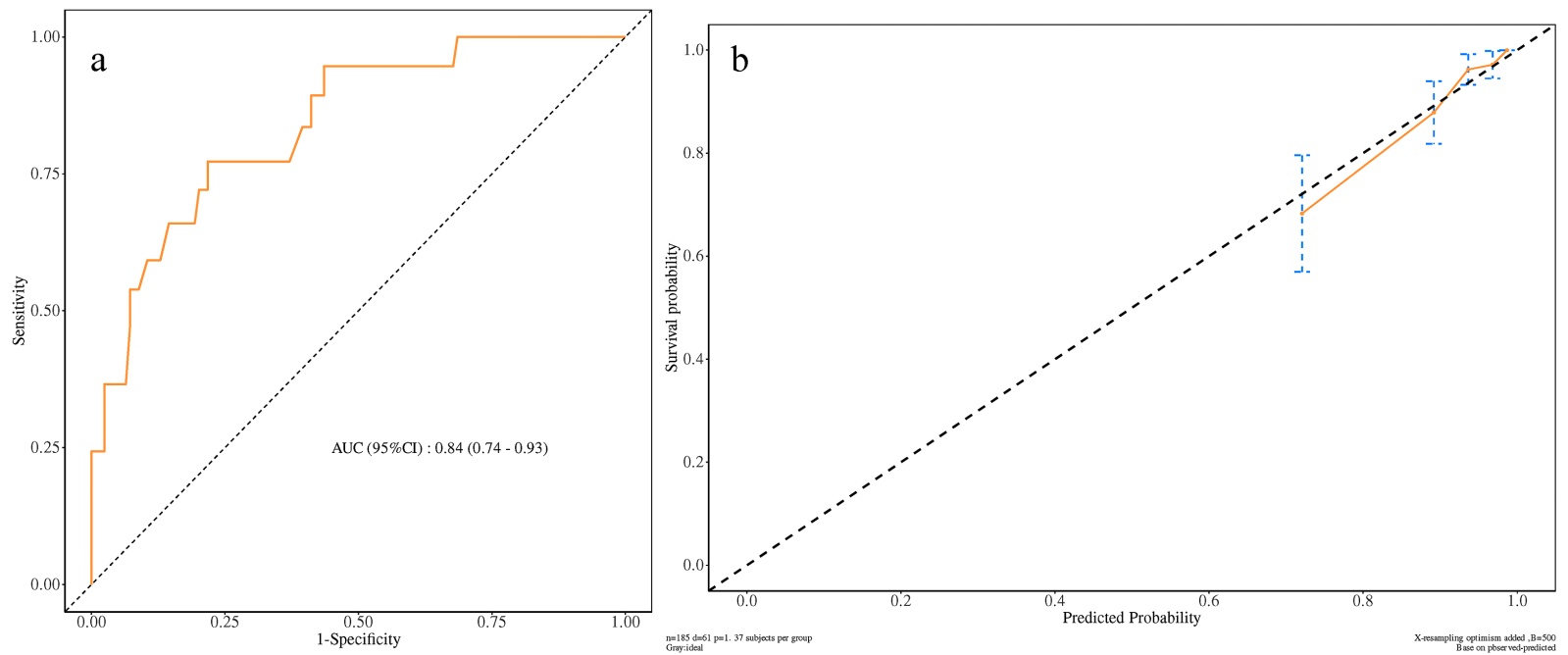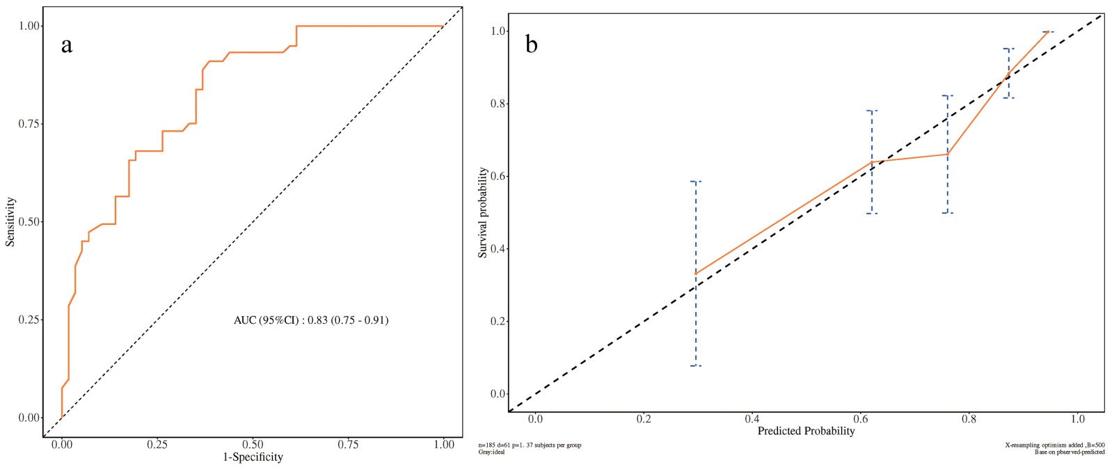 Figure 4. ROC curve (a) and calibration curve (b) predicting biochemical recurrence at 3 years after radical prostatectomy