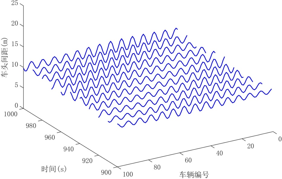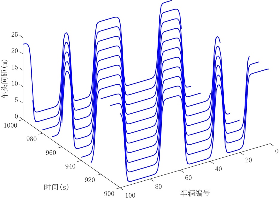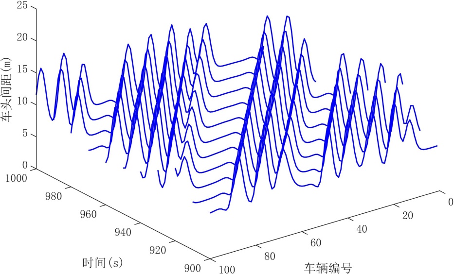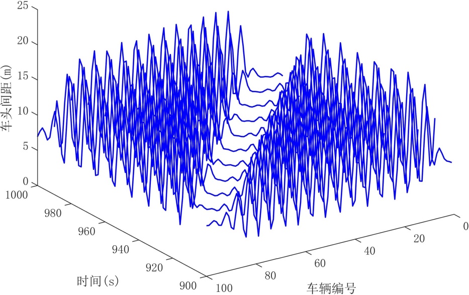 车流中的传播,从而提升交通流的整体稳定性。然而,较大的前车历史动力权重虽然能够增强加速度平滑效果,但同时也会放大历史动力信息所引入的时滞效应,降低系统对较大历史窗口的容忍度。当前车历史动力权重或历史窗口深度取值过大时,滞后效应逐渐占据主导,系统对扰动的响应能力明显削弱,进而导致交通流稳定性下降,重新出现“走走停停”现象。该结论与第3节中的线性稳定性分析结果相一致,从数值仿真的角度进一步验证了前车历史动力信息在提升系统稳定性与引入时滞效应之间存在的内在权衡关系。