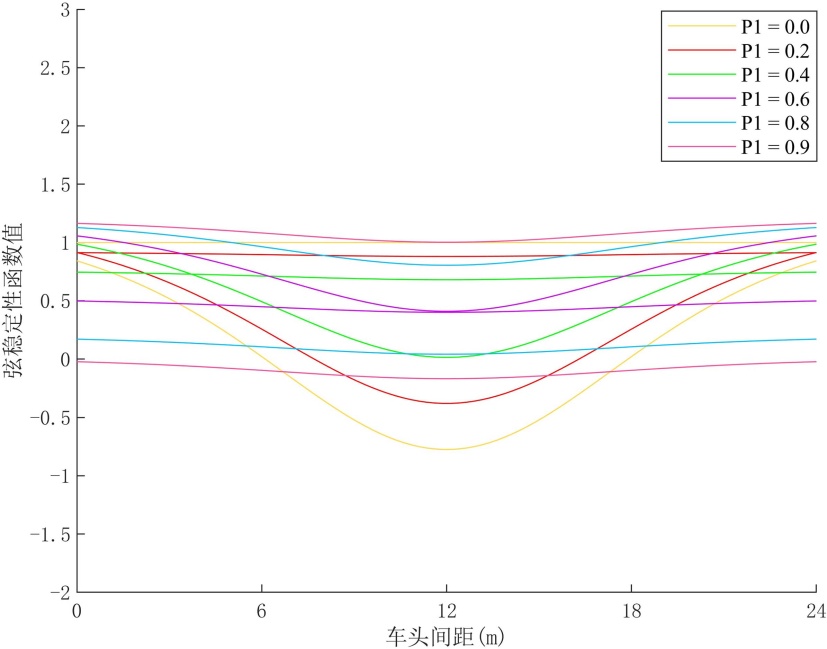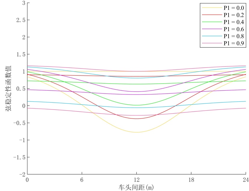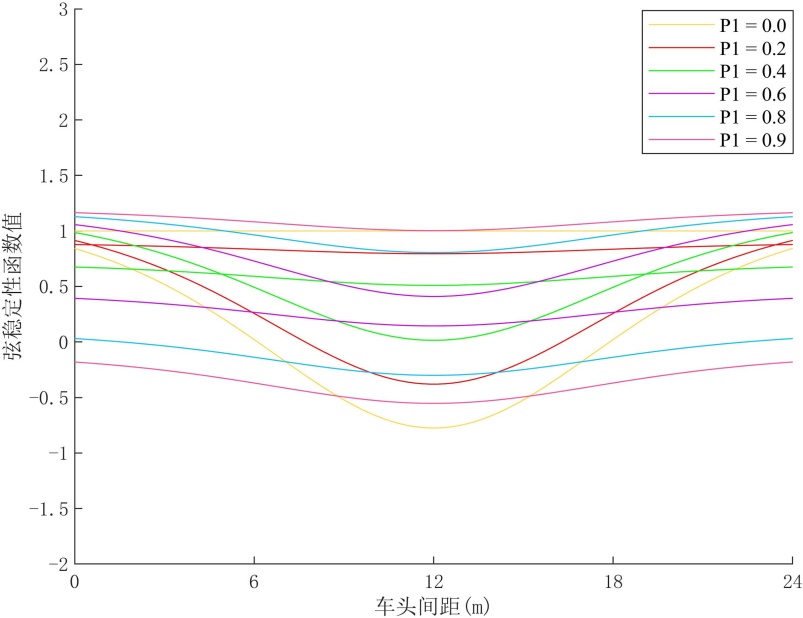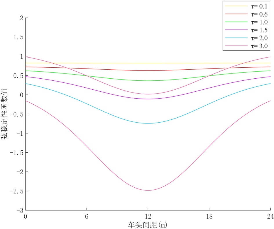 公式(7)给出了所建模的线性稳定性判定准则。当该稳定性条件满足时,交通扰动在车辆队列中的传播将逐渐衰减,该模型通过历史动力信息协作对扰动起到持续平滑作用,抑制速度与加速度波动。根据稳定性判定准则可以绘出系统的稳定性边界曲线。