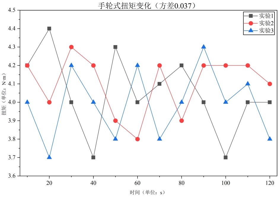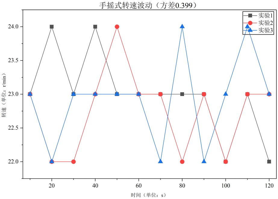 对比手摇式与手轮式驱动方式的效率与稳定性:通过扭矩传感器、转速测量仪监测,模拟实际负载阻力(带阻尼圆盘),维持转速23 r/min,持续2 min,记录转速与扭矩波动情况(图4)。结果显示,手摇式驱动的转速方差(0.399)与扭矩方差(0.014)均小于手轮式(转速方差2.422,扭矩方差0.037),稳定性更优,故确定驱动方式为手摇式。