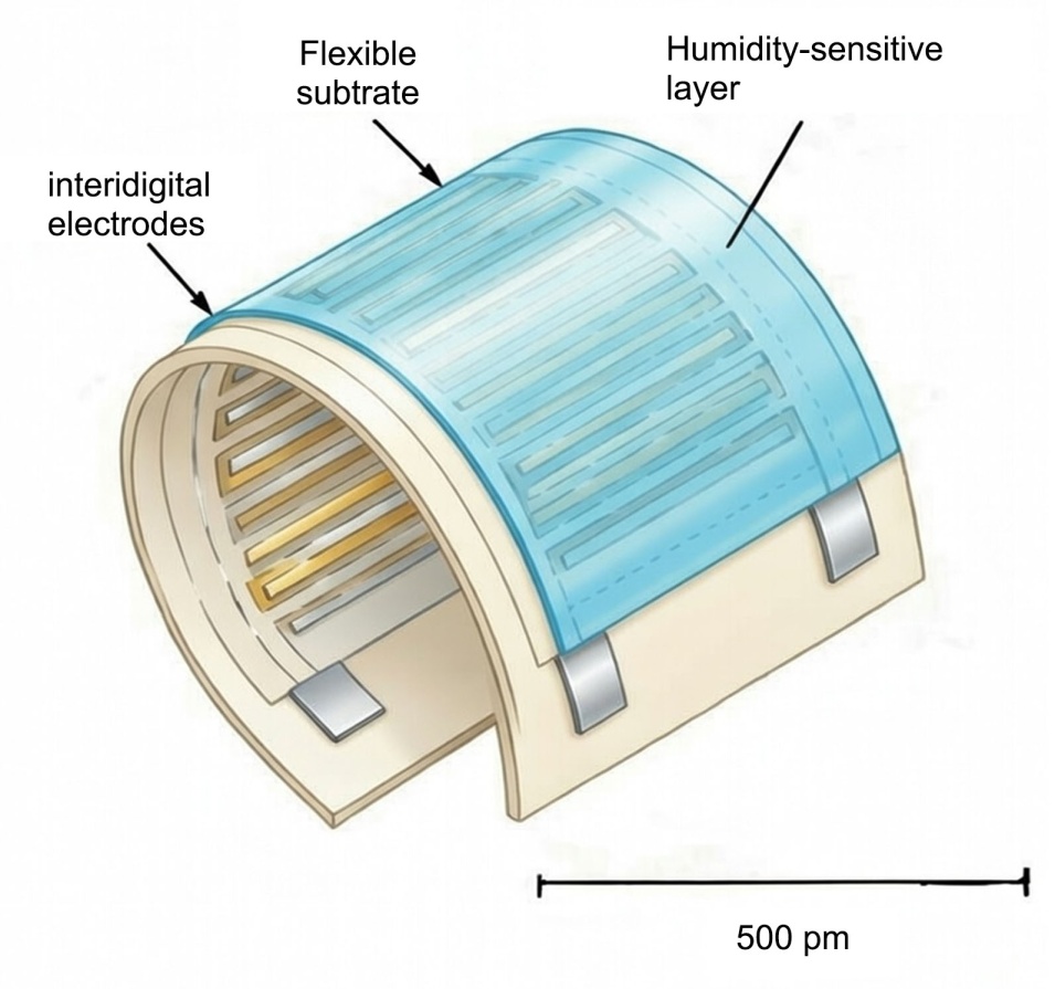 随着可穿戴技术的发展,传感器结构设计正从刚性向柔性演变。基底材料已从传统的氧化铝陶瓷、玻璃转向聚酰亚胺(PI)、PET及热塑性聚氨酯(TPU)。柔性化不仅仅是更换基底材料,更要求上层的电极与湿敏膜具备抗形变能力。如图3柔性基底所示的柔性平面叉指结构,需通过结构设计(如蛇形走线)或材料复合来释放弯曲产生的应力,防止导电层断裂或敏感膜剥离,确保在动态佩戴下的信号稳定性。