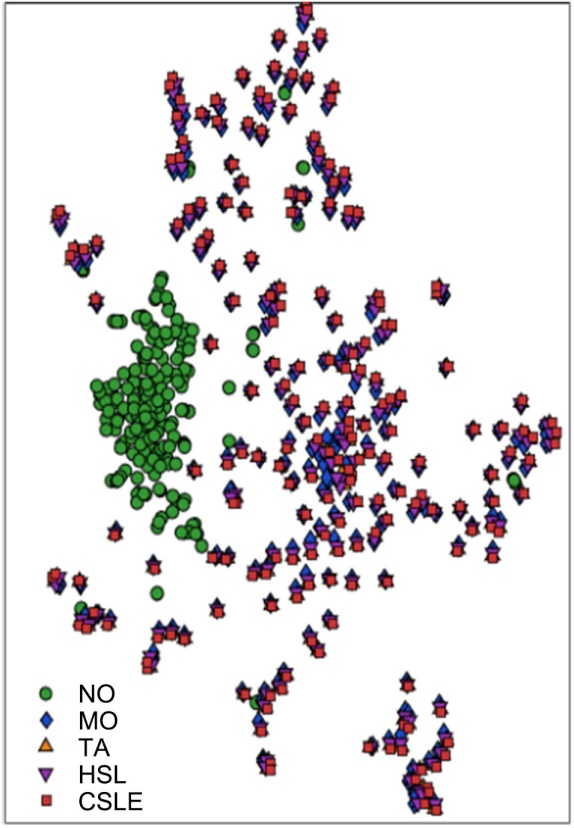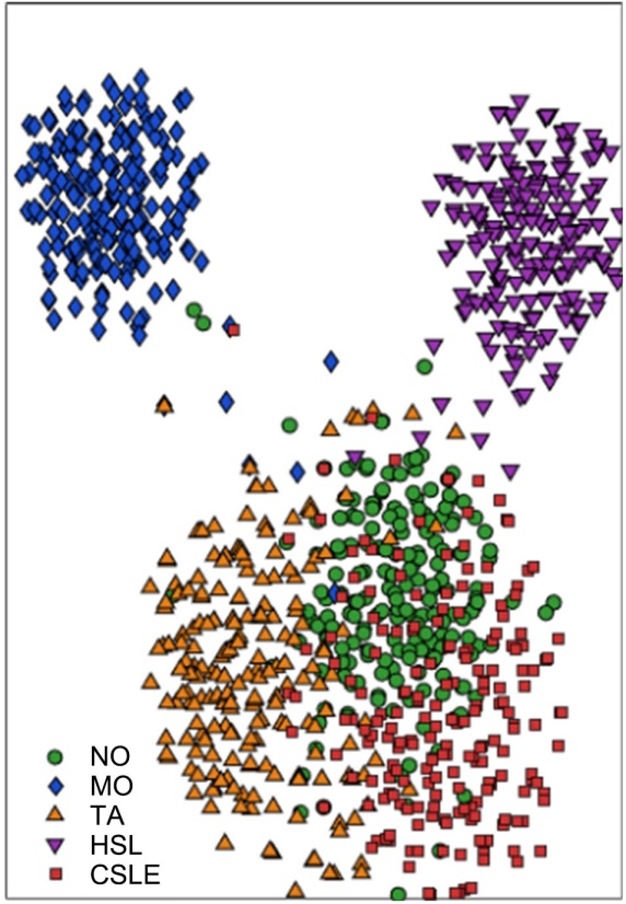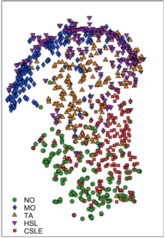 在测试诊断环节,设计对比实验以验证本文所提模型在故障诊断性能上的优劣。首先,固定时序建模器为LSTM,对比不同特征提取方法,包括传统非线性降维KPCA、深度学习AE、动态系统与非线性工具结合KCVA (本研究模型)和不进行额外特征提取的纯LSTM,以验证本模型在非线性降维方面的优势。绘制t-SNE散点图来展示不同特征提取方法在测试集下的数据特征可视化效果,如图4所示。原始数据因多维且特征间存在强耦合,导致不同健康状态的数据分布混杂,重叠严重,直接进行故障识别的难度大。经KPCA降维处理后的数据类间区分度相较原始数据有所改善,这是因为KPCA将数据映射到高维空间一定程度上展开了数据的非线性结构。但其改善效果有限,MO、TA、HSL、CSLE类别间仍然重叠明显,因为其优化目标是寻找全局方差最大的投影方向,对方差大、变化明显的特征给予更高权重,将相似样本强行投影到相近位置,为后续分类造成决策障碍。经AE降维处理后的数据在MO、TA、CSLE上存在显著重叠,这是因为三类故障都导致温度异常,而AE的静态数据重构目标使其对高方差特征(温度)更敏感,将具有相似温度的样本编码为相近特征。而NO和HSL的统计模式与这三类以温度为主导的故障差异明显,能较好地分离,形成相对独立紧凑的簇,但这种分离也是基于静态统计差异,不能体现故障的动态本质。经KCVA降维处理后的数据在紧凑程度上相较于其他方法最优且故障类间分离相对清晰。其中,MO、HSL相较于其他类别高度分离,这是因为KCVA能够挖掘数据过去与未来的动态关联,捕捉到电机动态与液压动态的系统差异。NO、CSLE存在有限重叠,但这种重叠与AE的故障重叠存在本质区别:KCVA中的重叠是局部的,这是因为轻微故障对系统动态扰动较小,轻微故障与健康状态具有连续性;而AE的重叠是全局的,是因为其对数据的静态的最优重构的依赖,不仅针对轻微故障也针对中等甚至严重故障。当故障发展到能够使系统动态关系发生显著变化时,KCVA能够有效区分NO和CSLE。这证明了KCVA所提取的是具有明确物理意义的动态特征,不仅判别力更强,也更能反映故障的演化过程,KCVA能够为后续故障识别提供更优的输入支撑。
