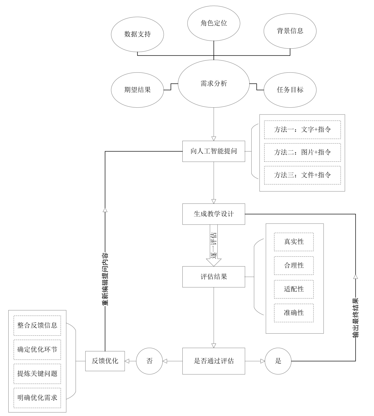 教学设计是教师教学工作的重要组成部分。经验丰富的一线教师在教学设计过程中常面临发展瓶颈[1],而新入职教师则因经验不足难以达到预期教学效果。人工智能因具有强大的数据处理能力和创新性内容生成等特点,可以依据教师的教学需求,生成适切的教学设计,从而为教师提供思路启发与备选方案[2]。为此,很多一线教师开始尝试运用人工智能开展教学设计,但多数教师使用AI时面临同一个困扰,即利用人工智能生成的教学设计很难达到预期效果。