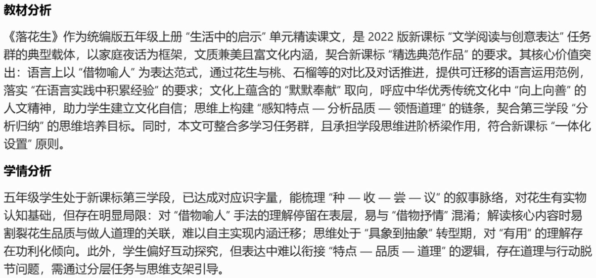 教学目标是教学的出发点,它的设置能够明确教师教什么、学生学什么。一份好的教学目标设计必须充分了解学习内容和学习对象,也就是教材分析和学情分析。这里我们可以根据生成式人工智能已经生成的教学设计进行补充改进,采用如表1提到的“角色定位 + 任务目标 + 背景信息 + 期望结果”的指令句式进行提问。例如,笔者把《落花生》这一课的电子教材和电子版的新课标上传给生成式人工智能并发送指令:我是一名小学语文教师,现在需要改进教学设计,请结合发给你的文件解析教材和新课标,改进教材分析和学情分析。最终得到以下内容。