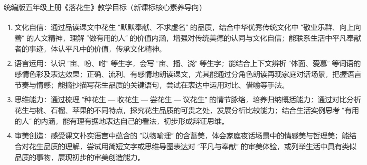 由图3可知,修改后的教学目标涵盖了四大核心素养,但是目标内容太多,一节课难以达成,因此笔者结合实际情况及自身能力,在此目标的基础上继续改进,最终在生成式人工智能的辅助下,整合并确定了以下教学目标:1) 认识并会写“亩、吩、榨”等生字,理解“体面、爱慕”等字词;2) 能正确、流利、有感情地朗读课文,通过分角色朗读,品读花生“默默奉献、不求虚名”的品质[6],理解“做有用的人”的价值内涵;3) 梳理“种花生–收花生–尝花生–议花生”的情节脉络,提升归纳概括能力,比较分析花生与桃、石榴、苹果的不同探究花生品质的可贵之处,发展比较分析能力[7];4) 结合对花生品质的理解,列举生活中具有类似品质的事物,培养审美创造能力。