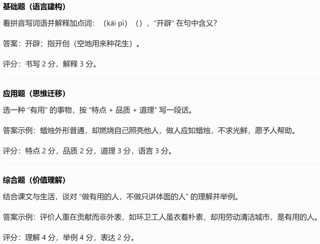 此外,我们还需要进行终结性评价设计,为系统检测学习效果,笔者追加指令:请基于教学目标与五年级学情,命制三道不同层次的素养立意试题(基础题、应用题、综合题),涵盖语言建构、思维迁移与价值理解,附带答案及评分标准。提问后,笔者将平台给出的答案做了截图,如图4所示。