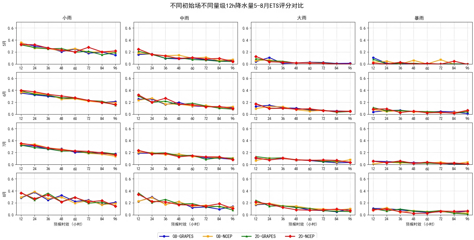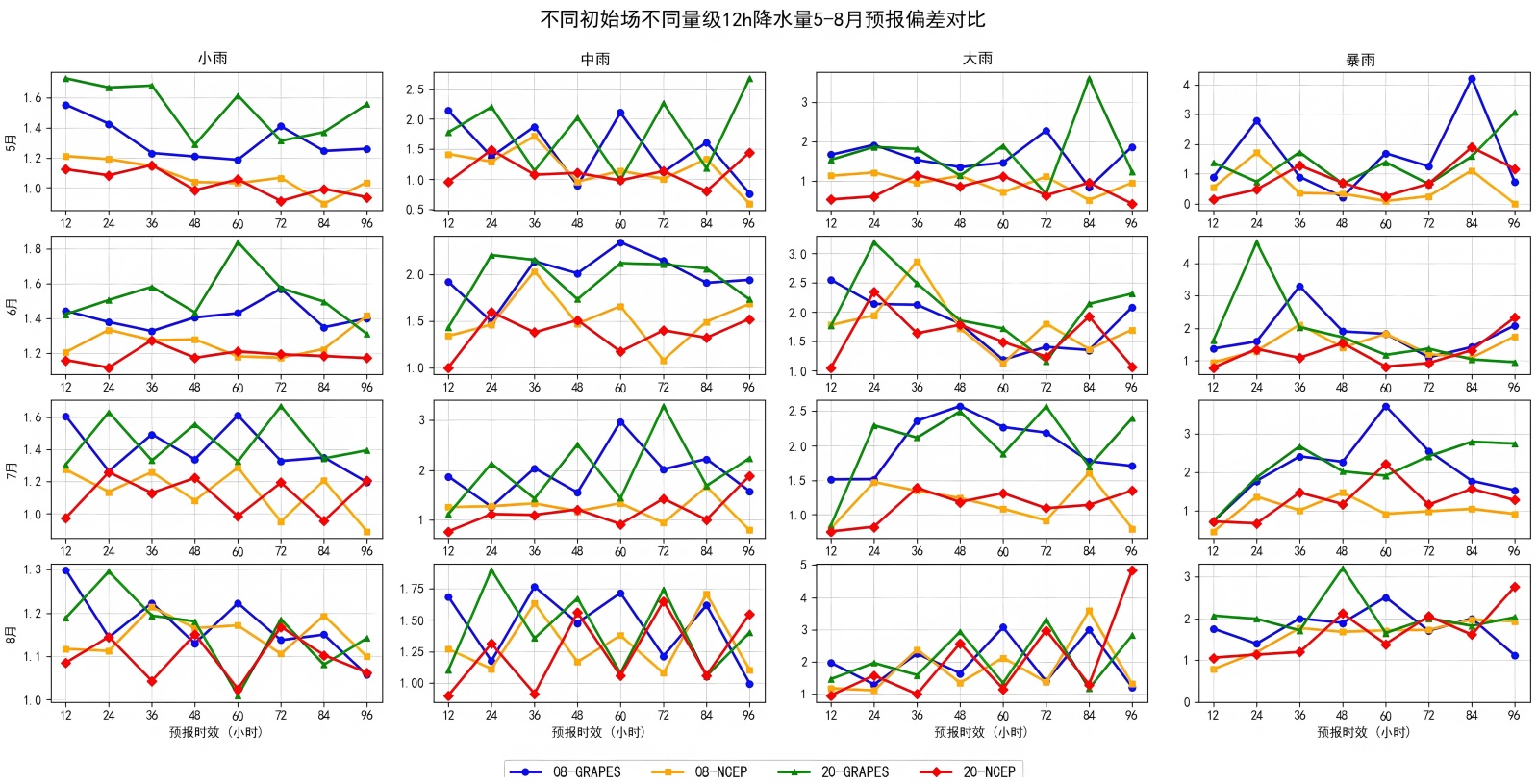 当降水量级提升至大雨和暴雨时,两模式的优势发生转变。GRAPES在短时效下对强降水的识别能力更强,TS与ETS均优于NCEP,尤其在主汛期表现突出。然而,其同时伴随更高的空报率和明显的正偏差,在长时效预报中偏差尤为显著。NCEP则在强降水中的预报更为保守,虚警更少,偏差更为平稳,但对强降水的命中能力略弱。