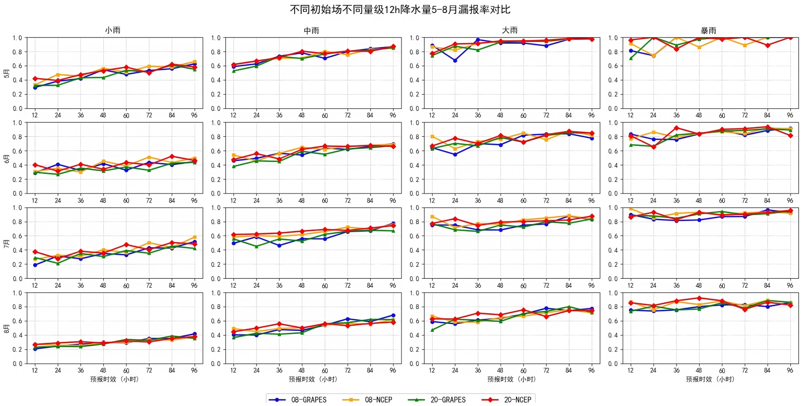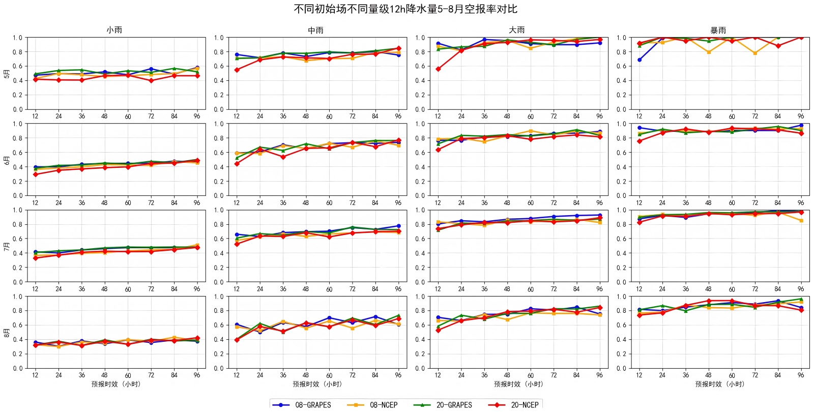 漏报率:在08时起报背景下,GRAPES模式在小雨和中雨量级的漏报率普遍低于NCEP,表现为对弱降水事件的捕捉能力更强,尤其在24~72 h预报时效中优势更加明显。而对于大雨及以上量级,GRAPES的漏报率在多数月份中仍保持较低水平。相比之下,NCEP虽然在部分大雨量级上漏报率略低于GRAPES,但整体波动较大,在时效延长后(如72 h与96 h)漏报率显著上升。20时起报结果显示,两种模式在不同雨量级上的漏报差异依然显著,但与08时起报相比均呈现不同程度的改善。然而,与GRAPES相比,NCEP在小雨与中雨等级仍表现出漏报偏高并随时效增长波动增大的特征。整体而言,20时起报条件下GRAPES的综合表现依旧优于NCEP,而NCEP对强降水的检出能力较08时起报略有提升但稳定性仍不足。