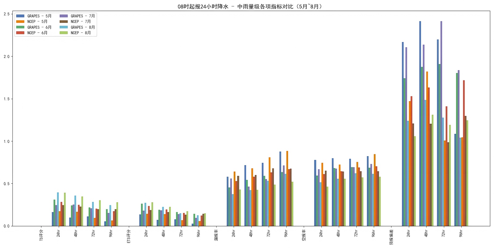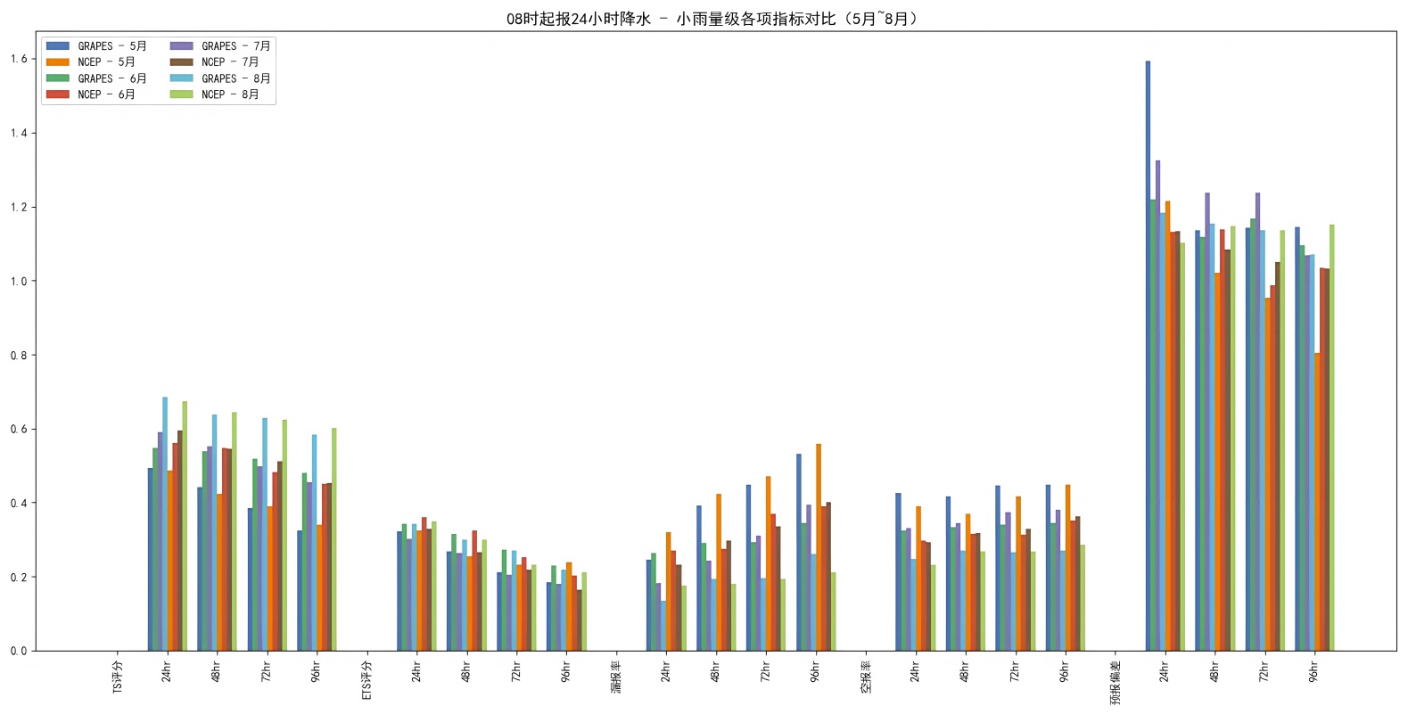 (1) 在小雨和中雨量级中,NCEP在TS和ETS评分上始终表现更佳,漏报率更低、空报率更稳定,整体预报偏差也明显小于GRAPES,体现出更高的弱降水和中等强度降水模拟可信度。与之相比,GRAPES在这两个量级中虽具备一定的捕捉能力,但更易产生过报和偏大的降水预估。